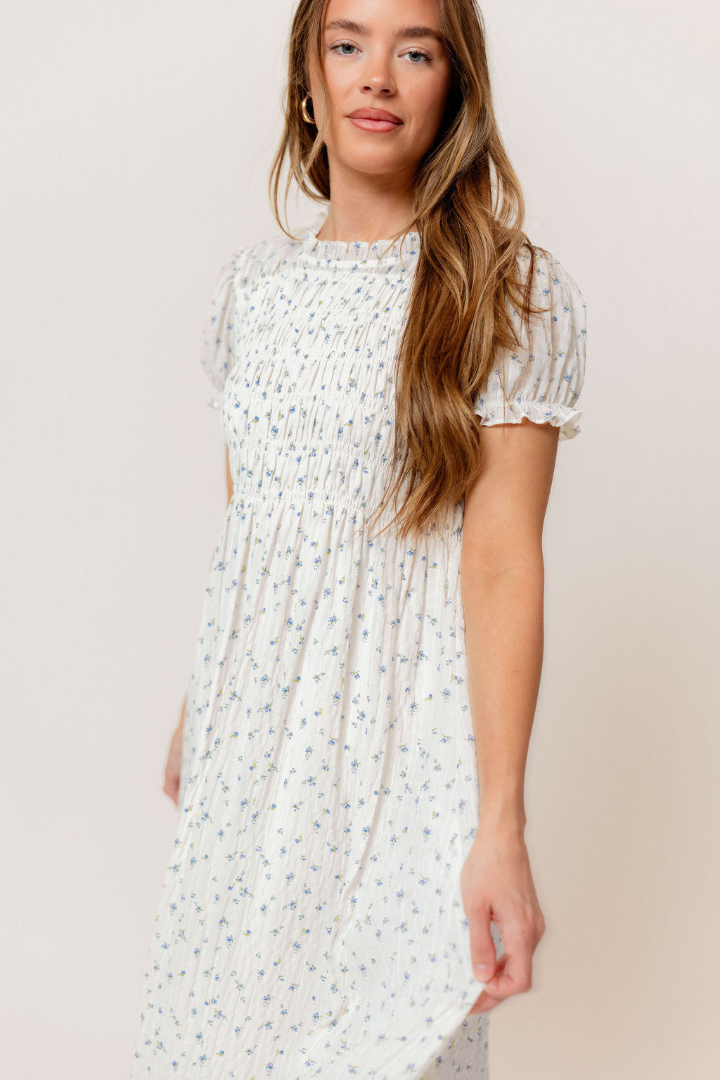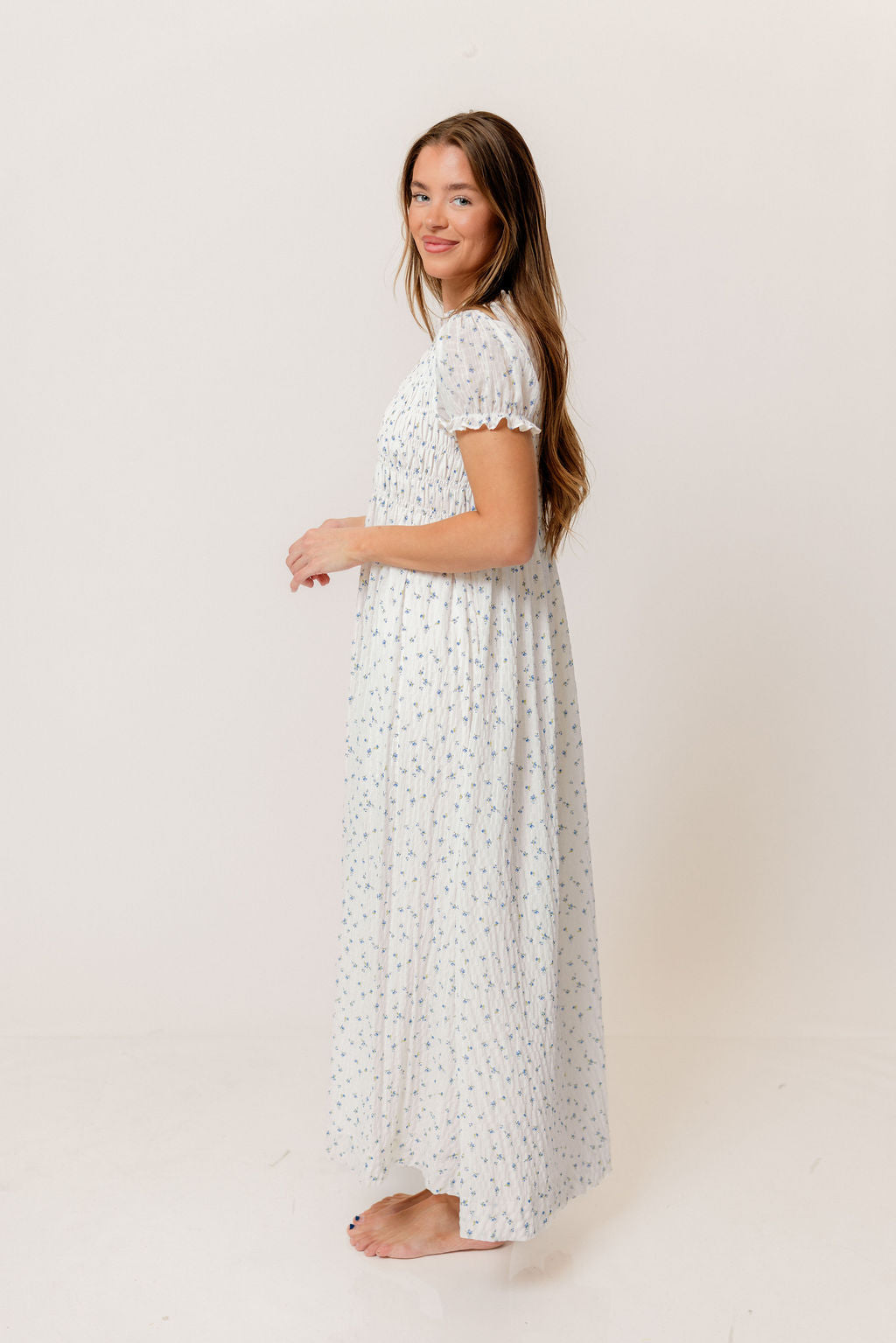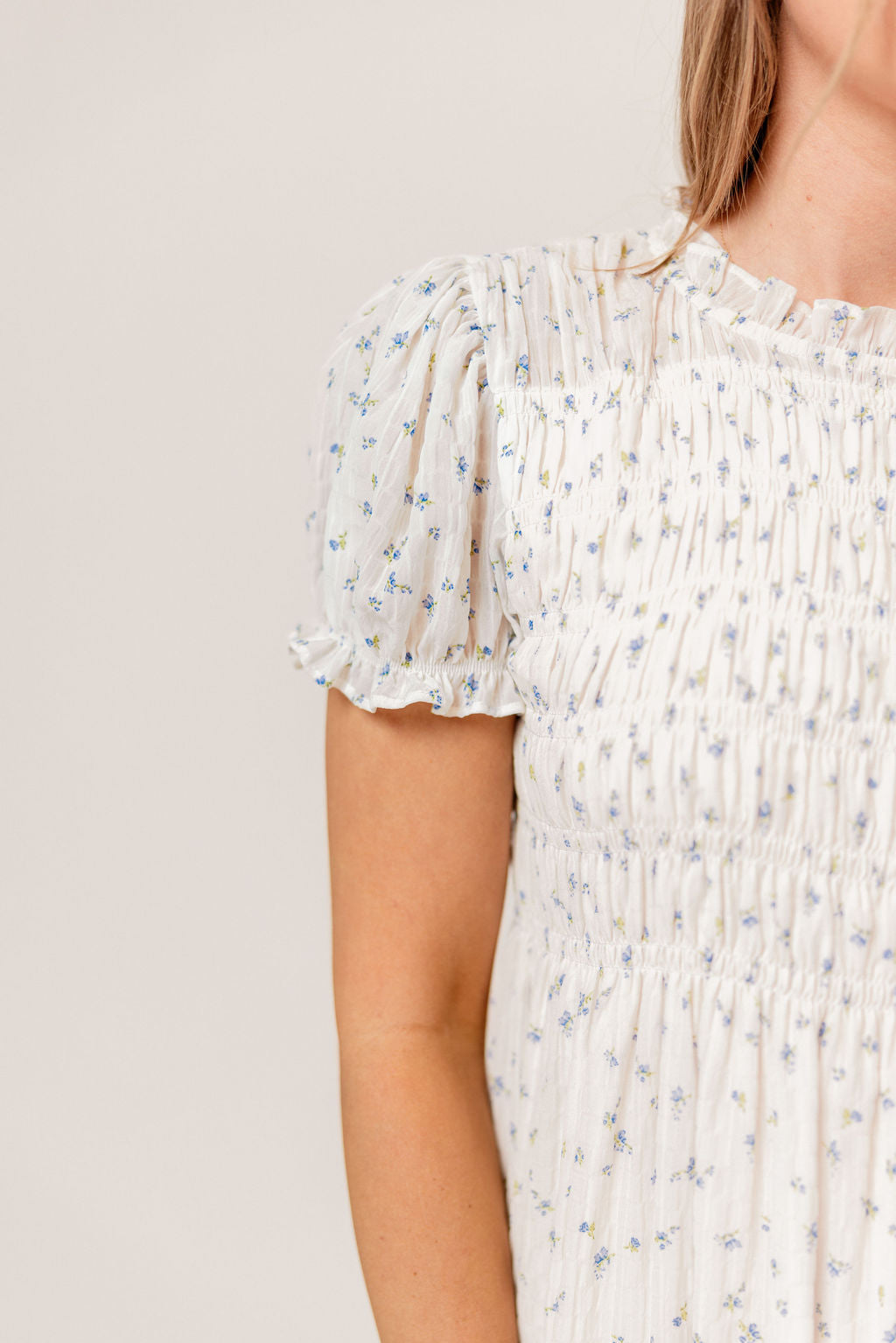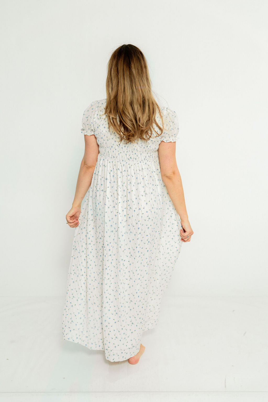 GARMENT DETAILS: Feminine maxi dress with high modest neckline, short puffed sleeves, and a fully smocked and stretchy bodice. Features an empire-waisted silhouette, with a wide, flowy skirt. Finished with delicate ruffle details.