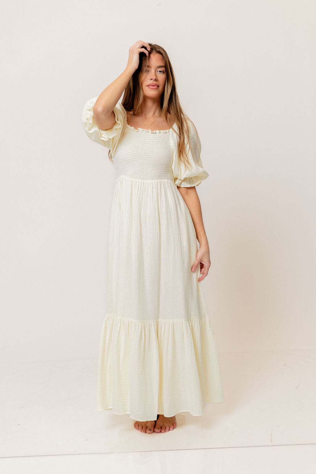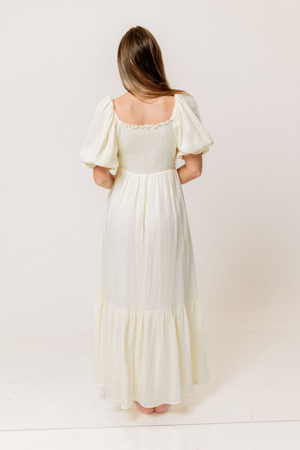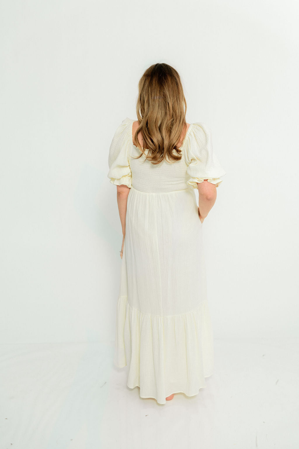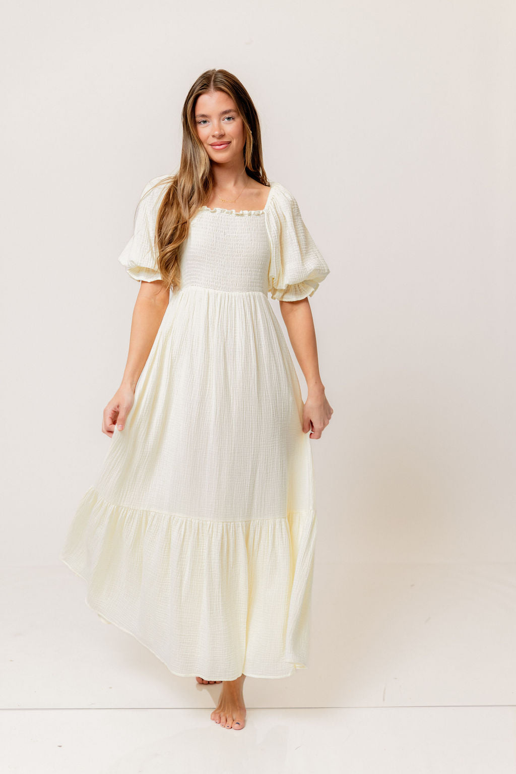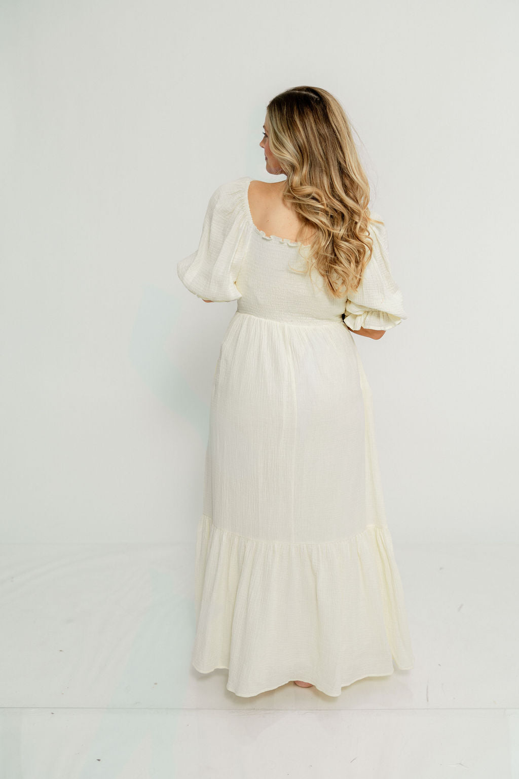 GARMENT DETAILS: Beautiful cotton gauze maxi dress with square neckline, smocked bodice, and puffed 1/2 length sleeves. Features a modest, stretchy neckline that can be worn on or off the shoulders, with a tiered maxi skirt. Fully lined.