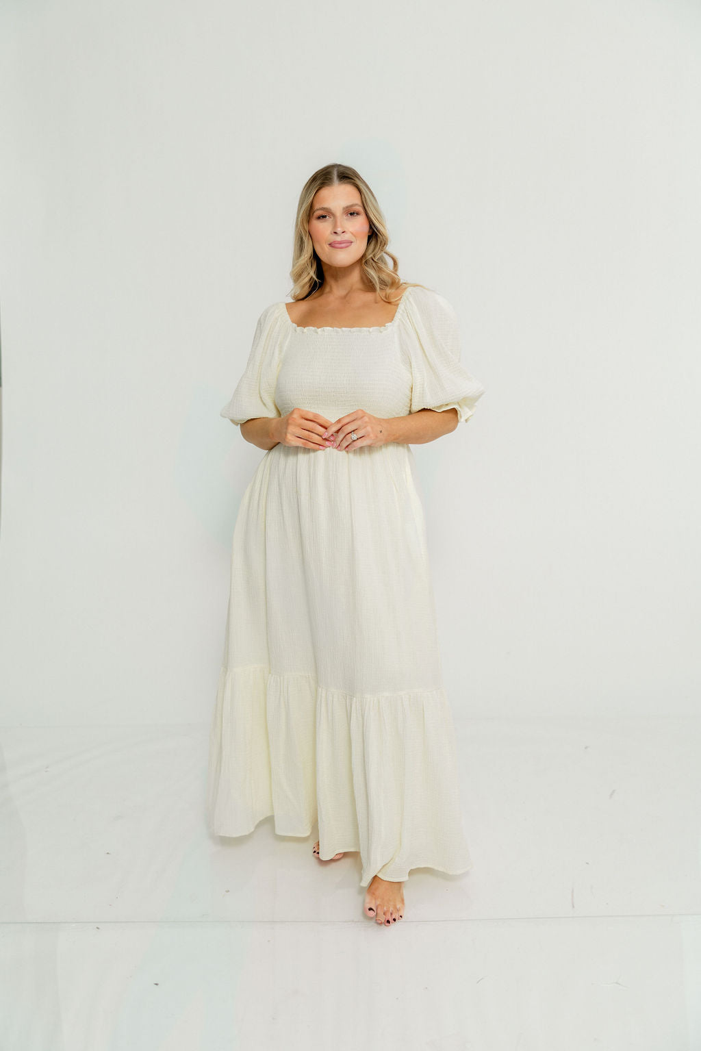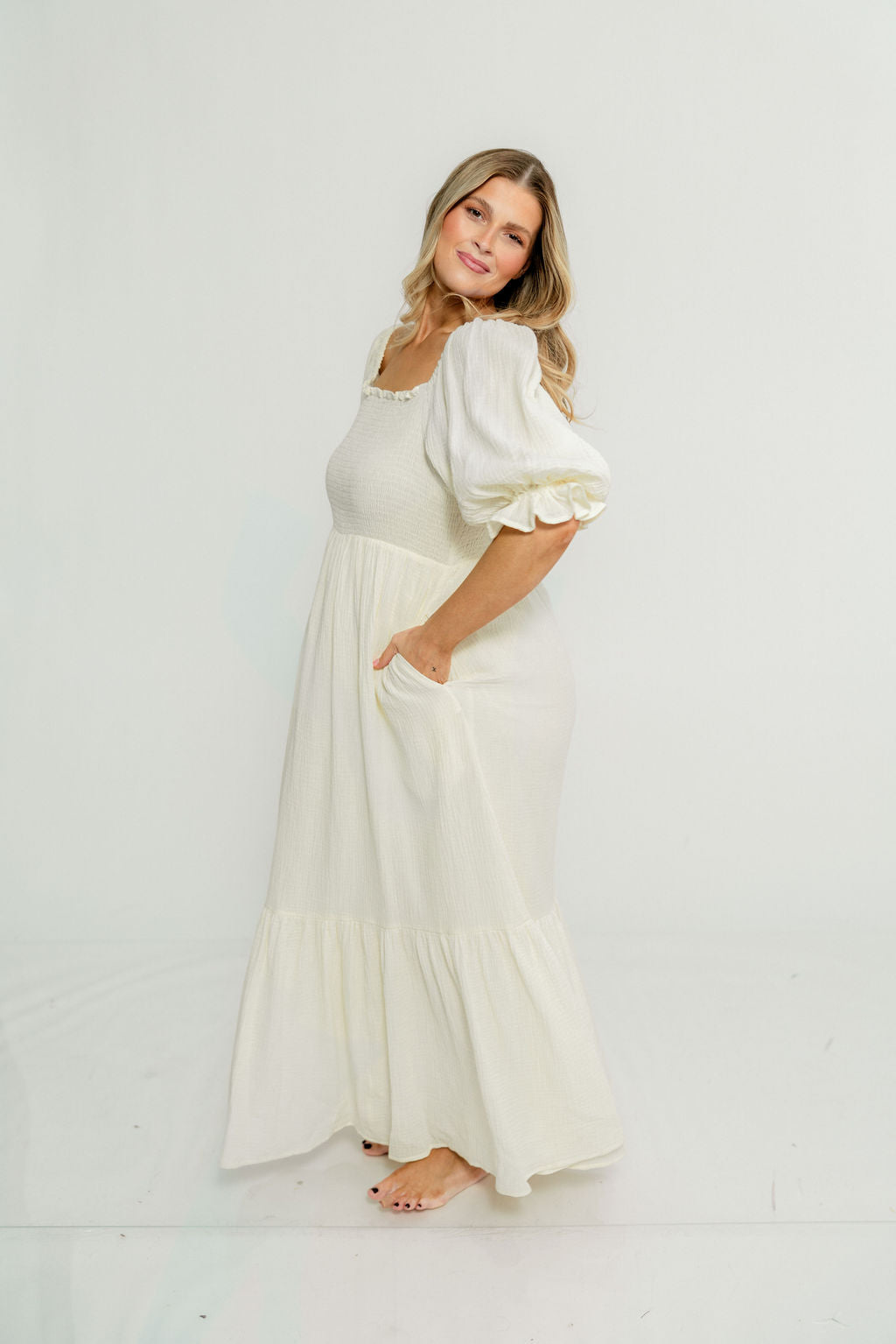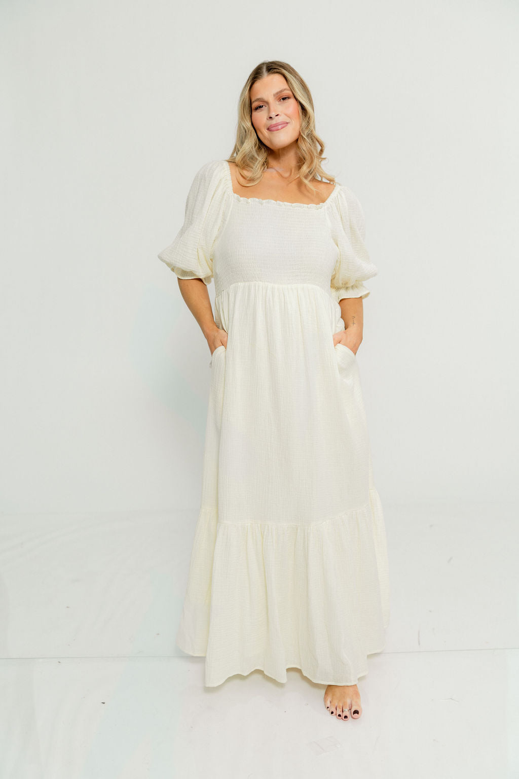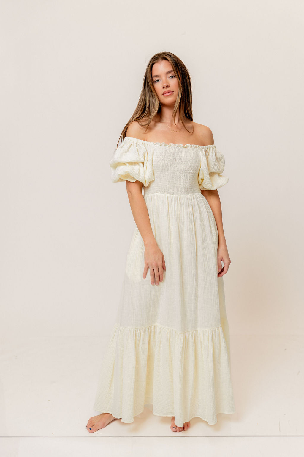 GARMENT DETAILS: Beautiful cotton gauze maxi dress with square neckline, smocked bodice, and puffed 1/2 length sleeves. Features a modest, stretchy neckline that can be worn on or off the shoulders, with a tiered maxi skirt. Fully lined.