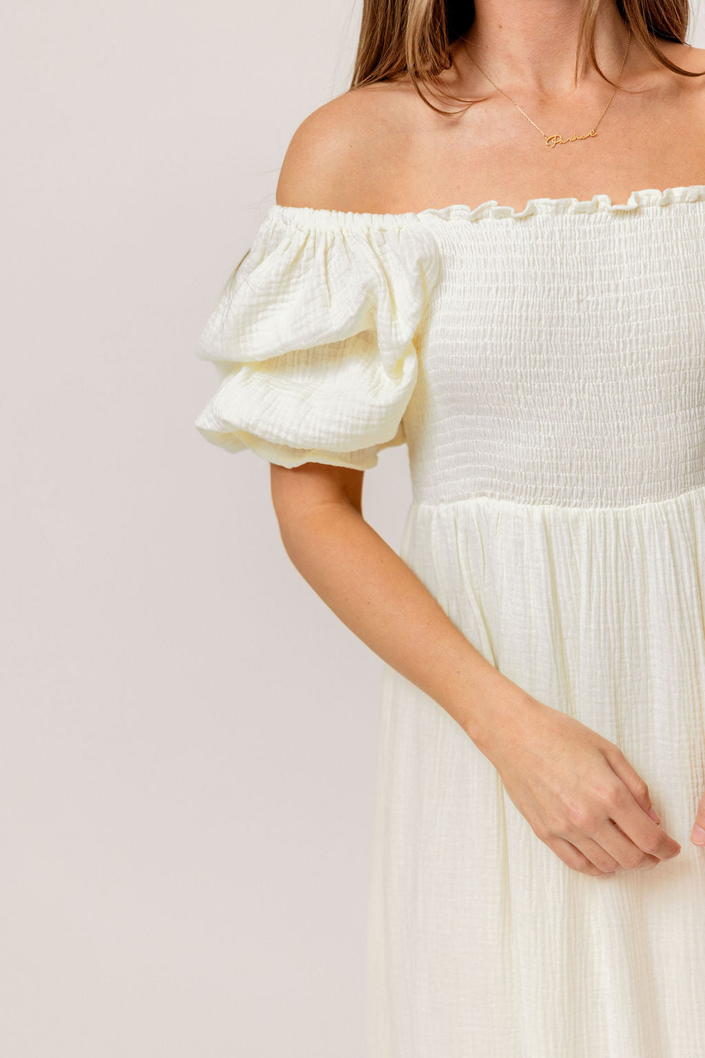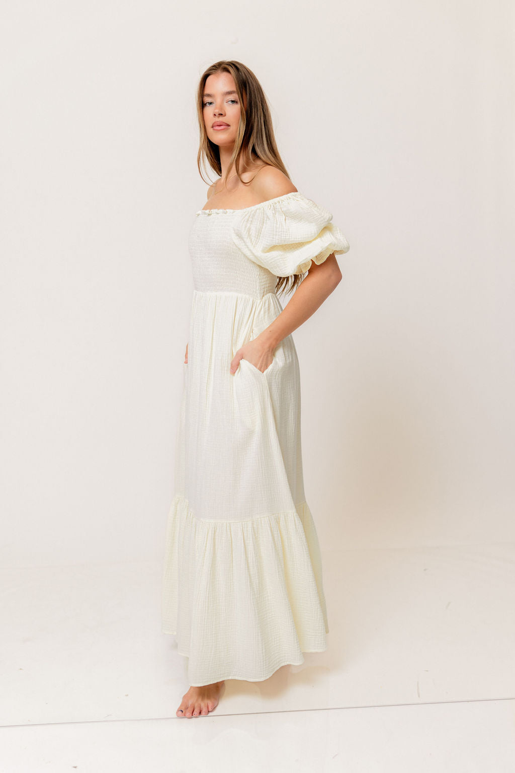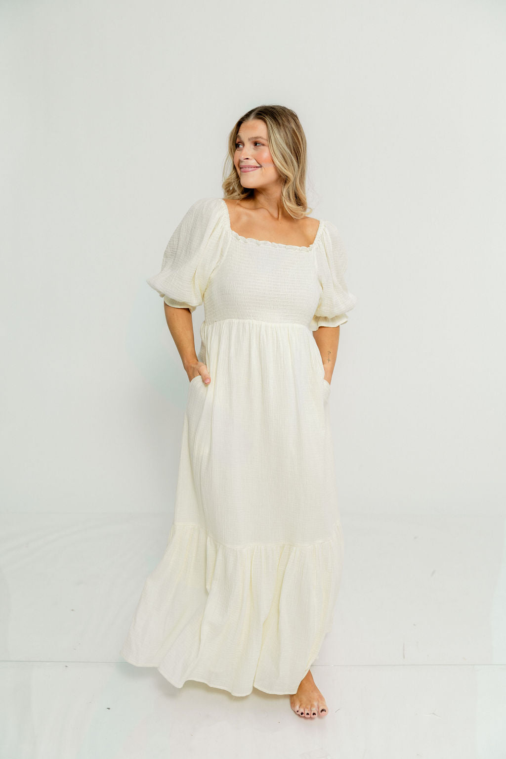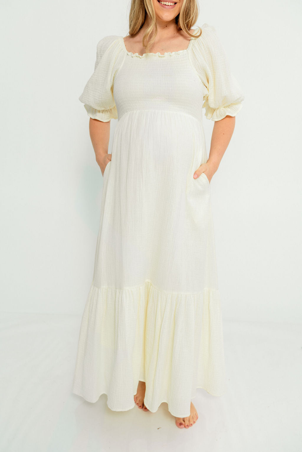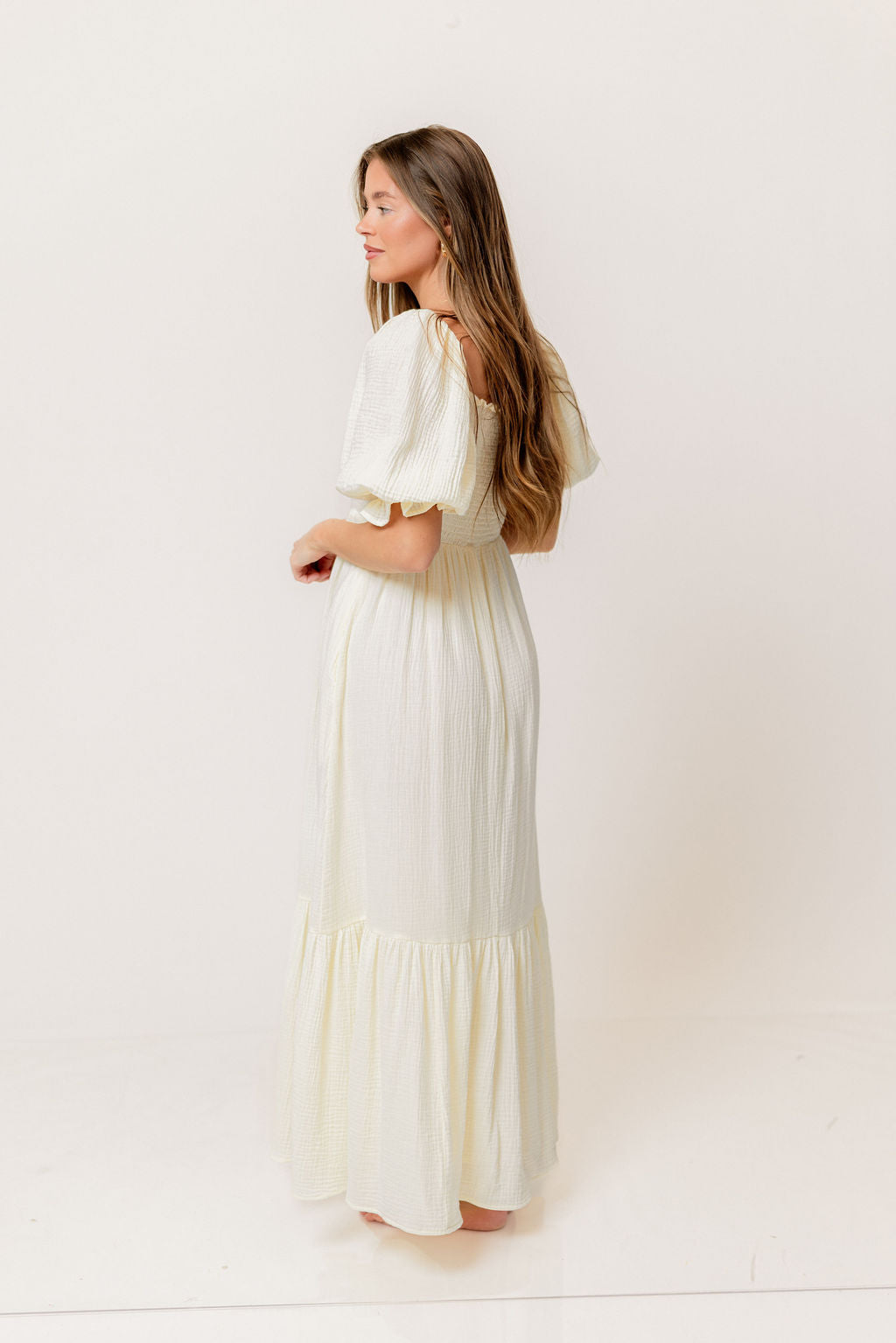 GARMENT DETAILS: Beautiful cotton gauze maxi dress with square neckline, smocked bodice, and puffed 1/2 length sleeves. Features a modest, stretchy neckline that can be worn on or off the shoulders, with a tiered maxi skirt. Fully lined.
