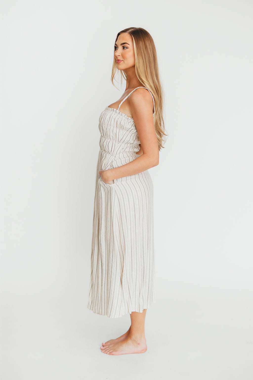 GARMENT DETAILS: Premium linen-blend midi dress with square neckline, adjustable spaghetti straps, and a gathered, smocked bodice. Features hidden in-seam side pockets and lining.