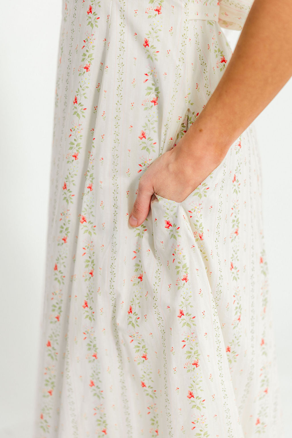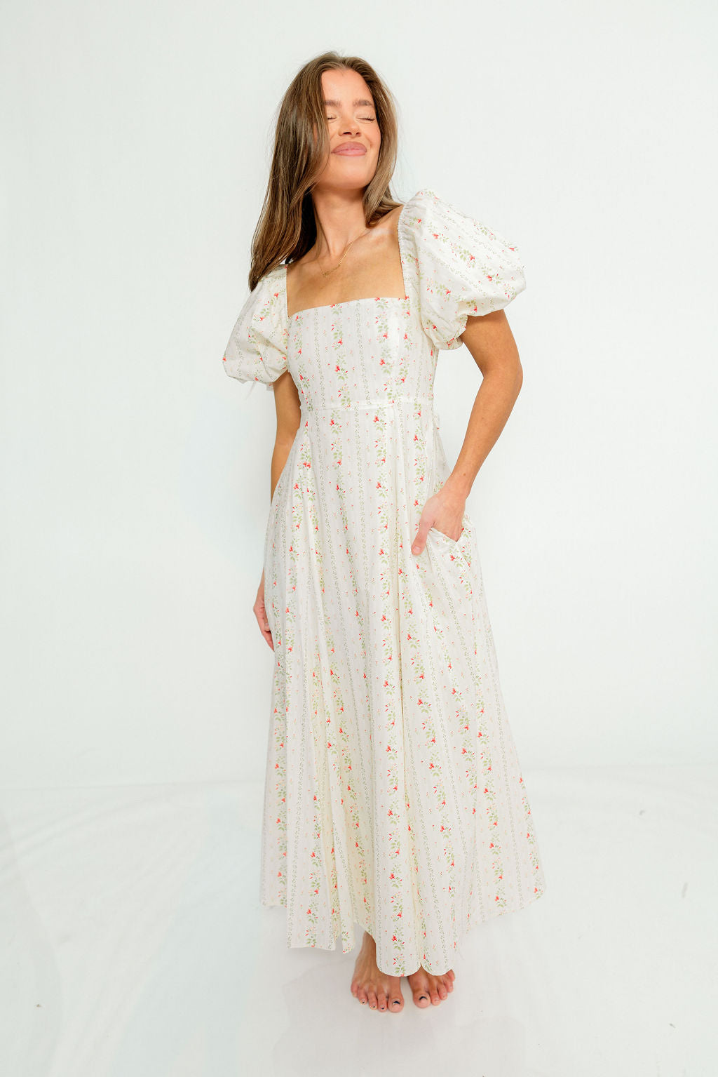 GARMENT DETAILS: Elegant cotton maxi dress with a fitted bodice, square neckline, and stretchy smocked back panel for comfort. Features statement puffed sleeves, attached self-tie sash, and dual side pockets. Finished with a flowy maxi-length skirt and hidden side zipper. Fully lined.