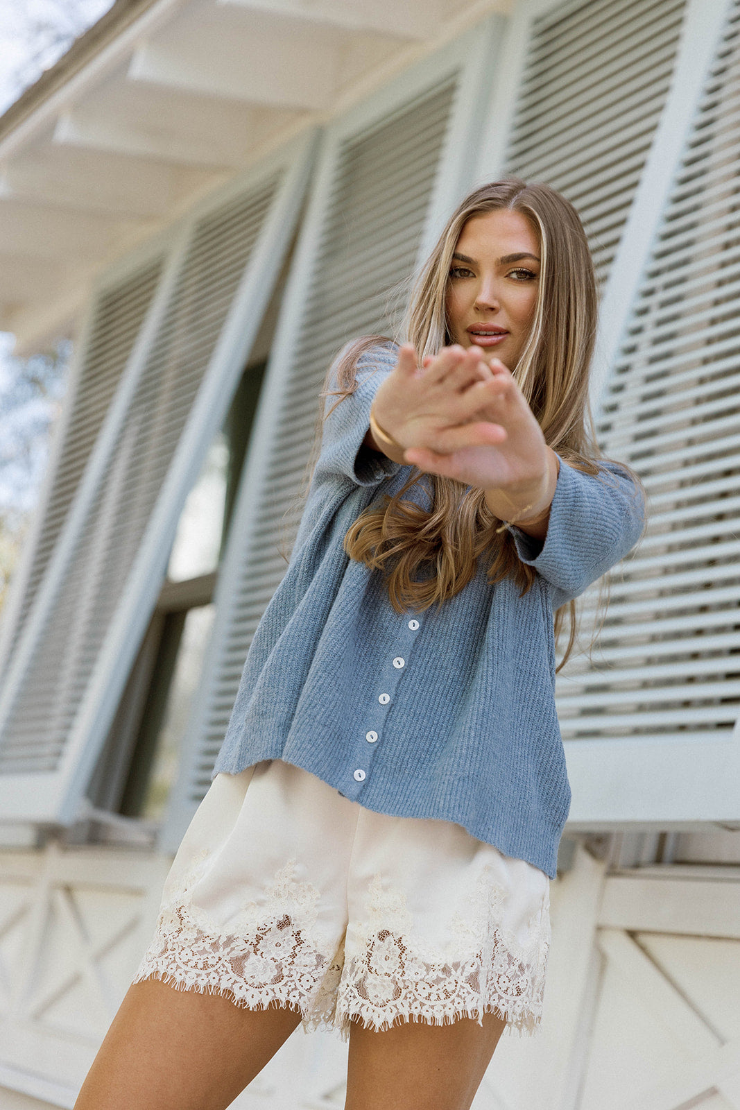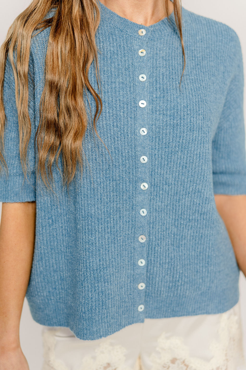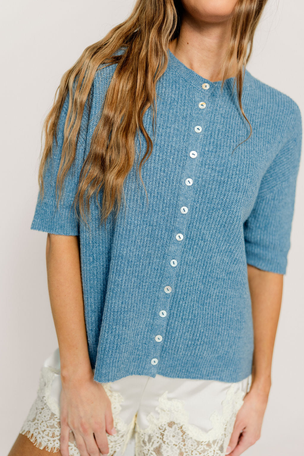 Cherie Button Down Cardigan Top in Dusty Blue