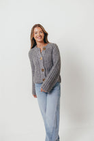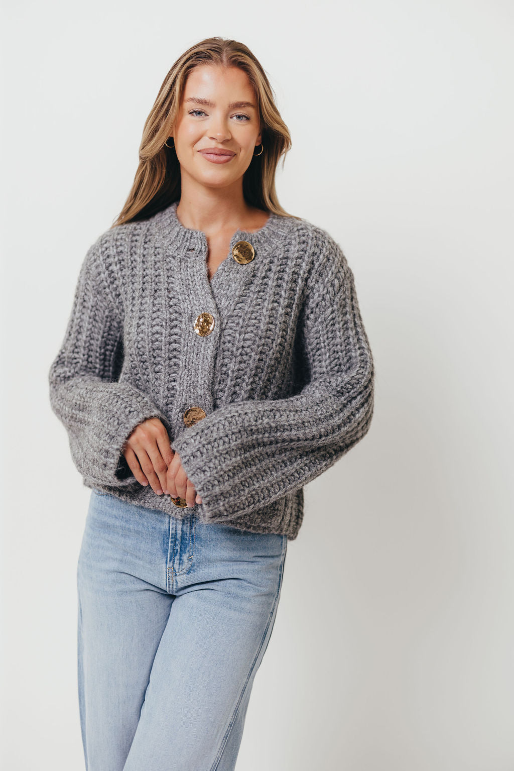 Nothing says comfort like the new Goldie Chunky Cardigan! This gorgeous wool-blend top is sophisticated and charming, with shiny gold buttons that add a dash of sparkle to your everyday look.