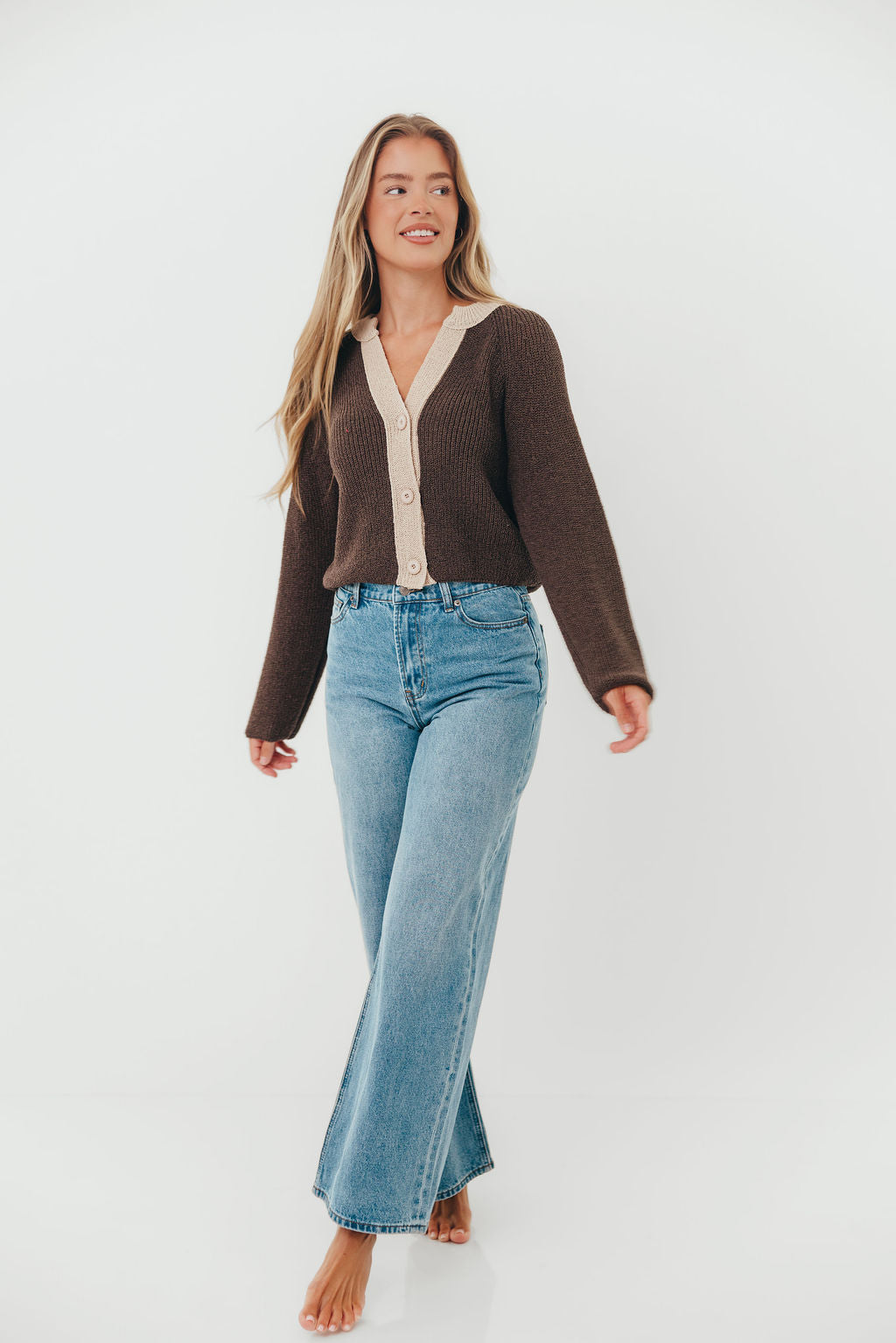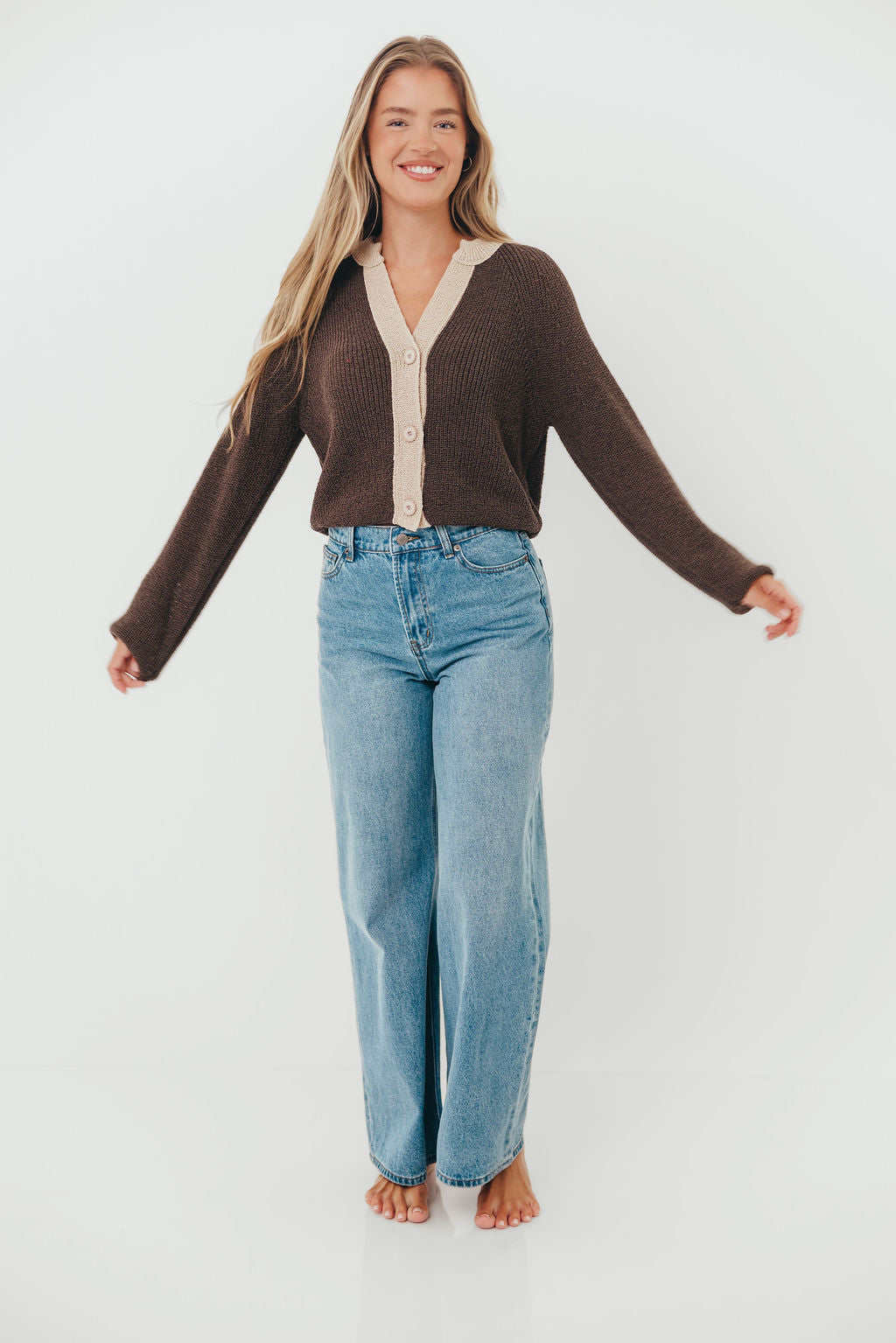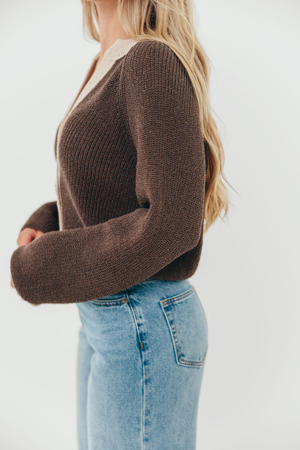 Meet our new favorite cardigan! The Holland Top features a chunky knit and darling contrast color placket that give this classic sweater a little extra zhuzh. Pair with your favorite high-rise jeans for an easy yet sophisticated outfit.