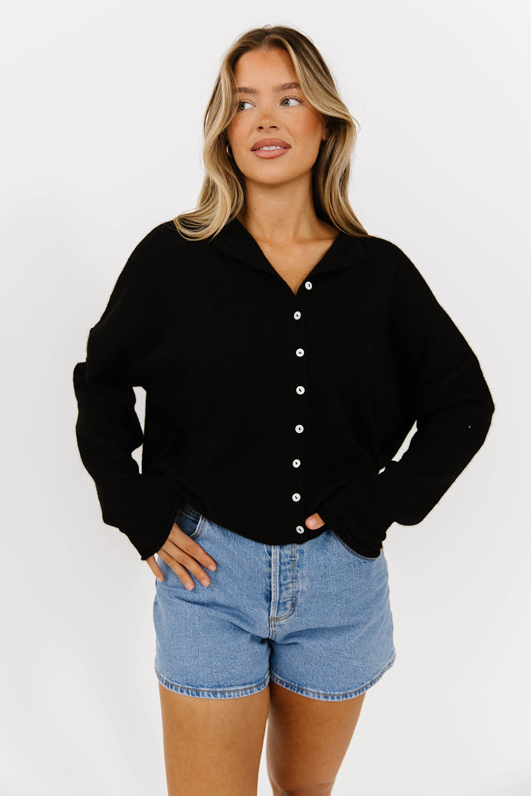 GARMENT DETAILS: Soft and feminine cardigan with long sleeves and rolled hem. Features dainty button front closure.