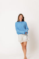 GARMENT DETAILS: Soft and feminine cardigan with long sleeves and rolled hem. Features dainty button front closure.