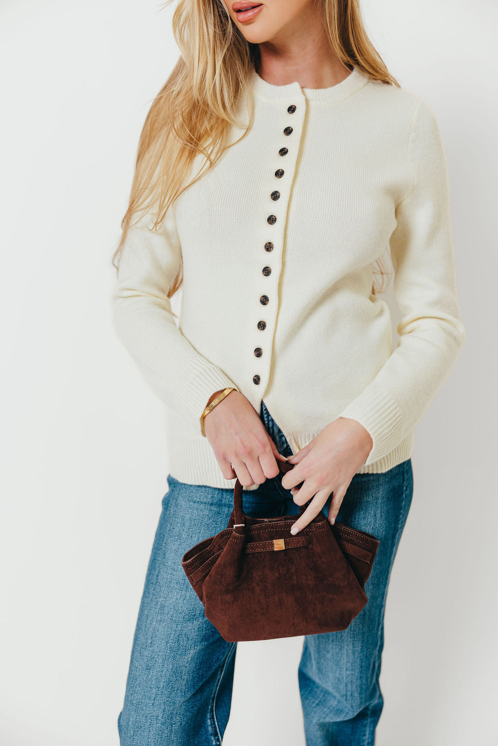 Elegance meets versatility with our new Priya Cardigan! This charming knit sweater offers a truly sophisticated silhouette, with contrast color buttons and a sleek, refined fit that's perfect for pairing with trousers or denim.