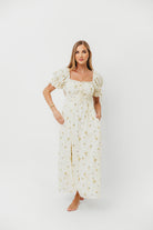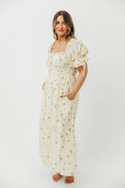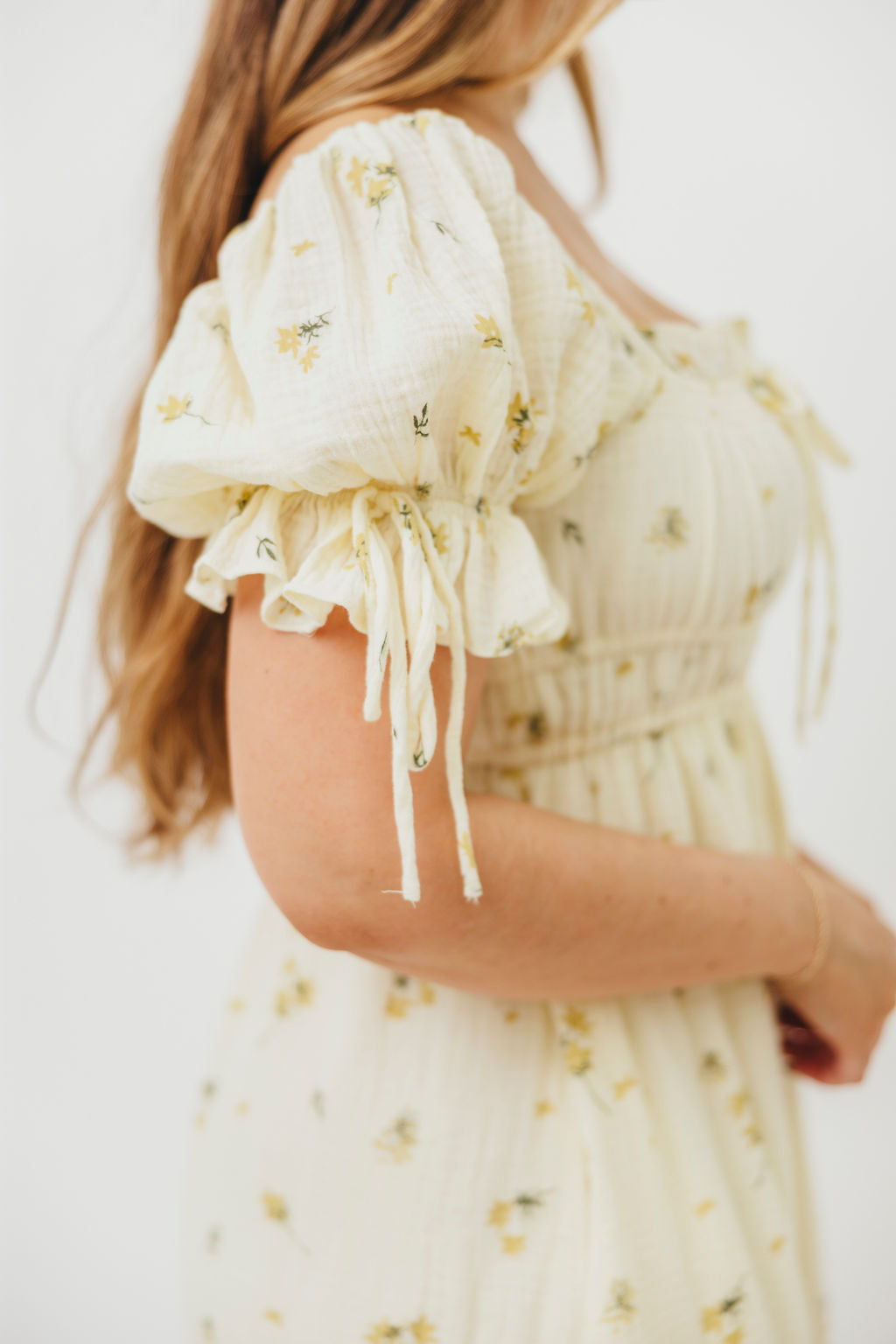 GARMENT DETAILS: Ultra-soft and lightweight 100% cotton maxi dress. Features a square neckline with dainty puffed sleeves, smocked waistband, and tie accents throughout. Finished with side pockets and lining.