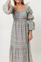 GARMENT DETAILS: Premium cotton midi dress in a vintage-inspired floral print. Features a square neckline with elasticized shirring around the bust, with voluminous gathered long sleeves and a tiered skirt.