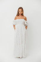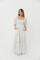 GARMENT DETAILS: Lightweight 100% cotton maxi dress with square neckline, short puff sleeves, and fully smocked, stretchy bodice. Features an elegant floral print and side pockets. Elasticated neckline can be worn on or off the shoulders. Lined.