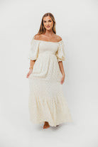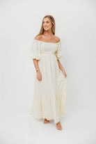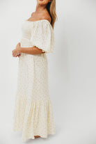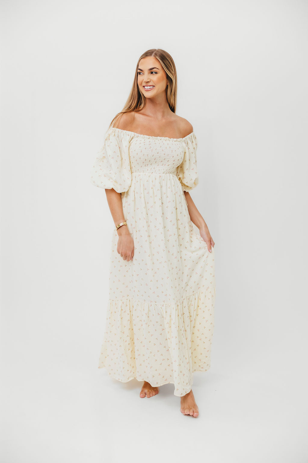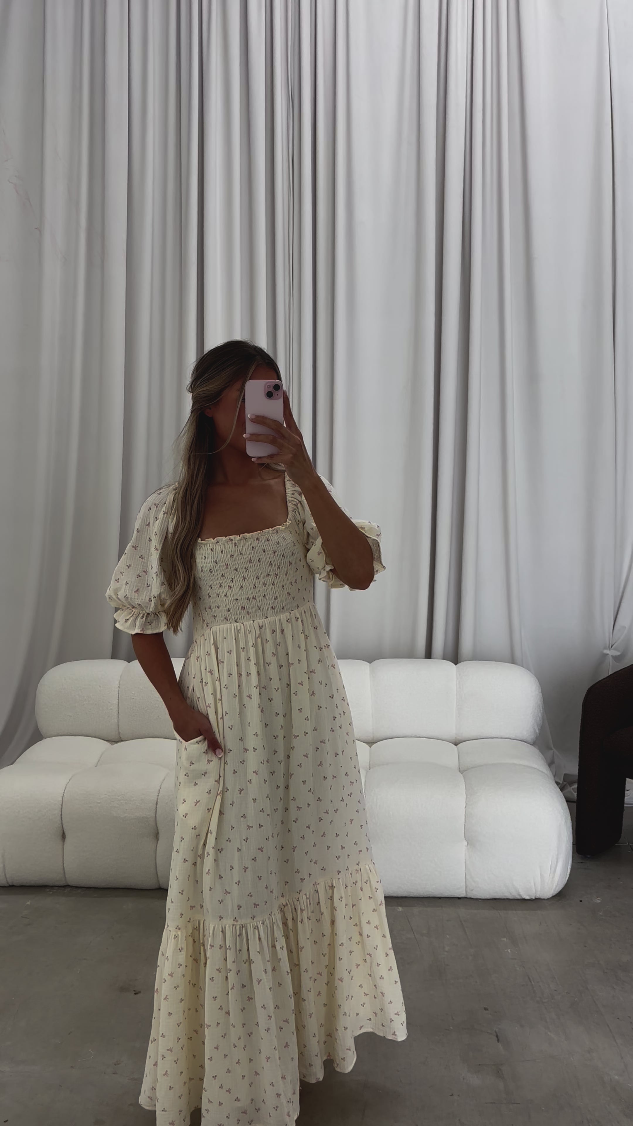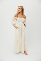 GARMENT DETAILS: Lightweight maxi dress with square neckline, short puff sleeves, and fully smocked, stretchy bodice. Features an elegant floral print and side pockets. Elasticated neckline can be worn on or off the shoulders.