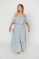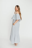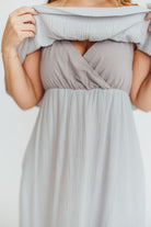 GARMENT DETAILS: Elegant 100% cotton maxi dress in a downy soft cotton fabric, with an off-the-shoulder neckline and bodice overlay that covers a nursing-friendly crossover bodice. Features a ruffled maxi skirt and in-seam side pockets.
