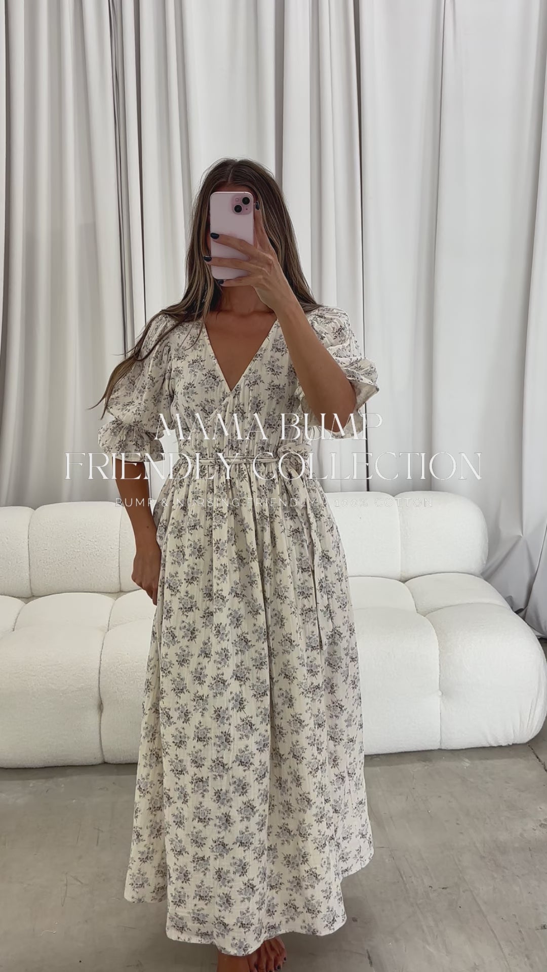 GARMENT DETAILS: Elegant 100% cotton maxi dress in a premium lightweight design, with V-neckline, 3/4 length ruffled sleeves, and a wrap design that allows for adjusting the fit as your pregnancy progresses. Finished with a self-tie sash and side pockets.