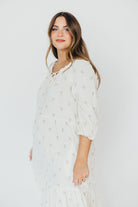 GARMENT DETAILS: Lightweight, relaxed-fit midi dress with a gathered V-neckline and drawstring detail. Features 3/4 length sleeves with elastic cuff, and a very full, multi-tiered skirt.