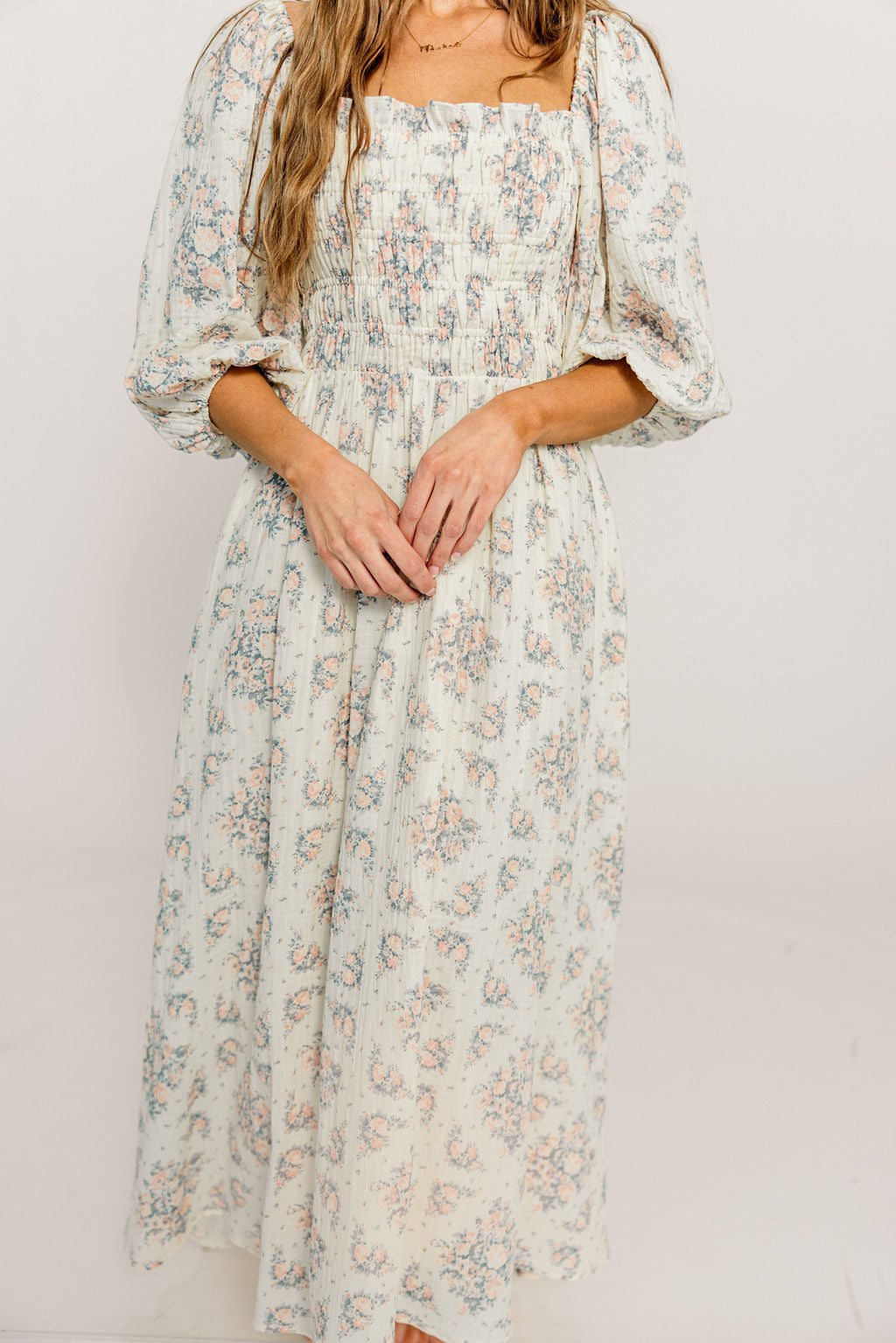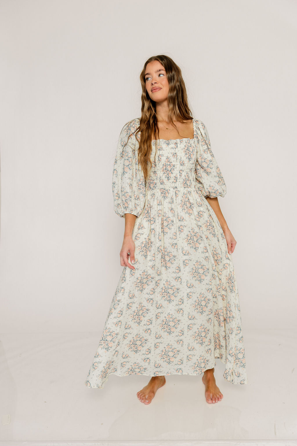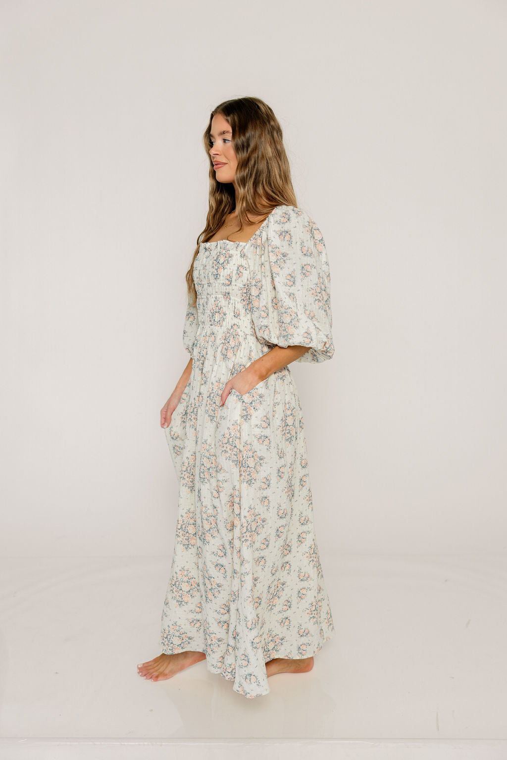 Harper Midi Dress in Ivory/Pink Floral