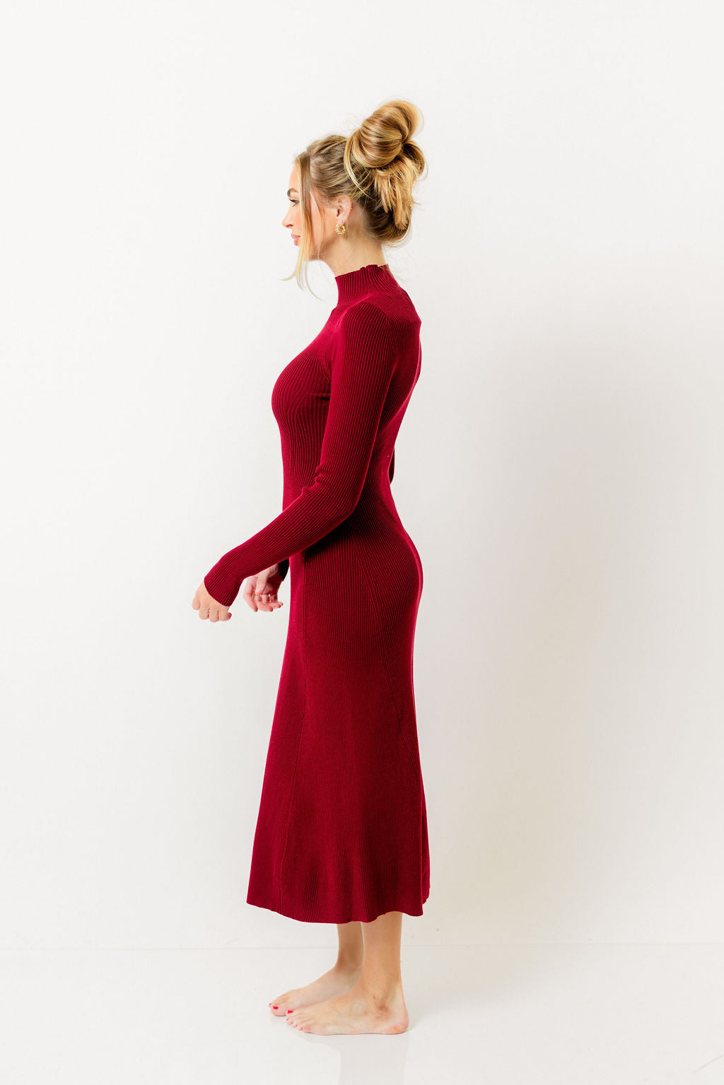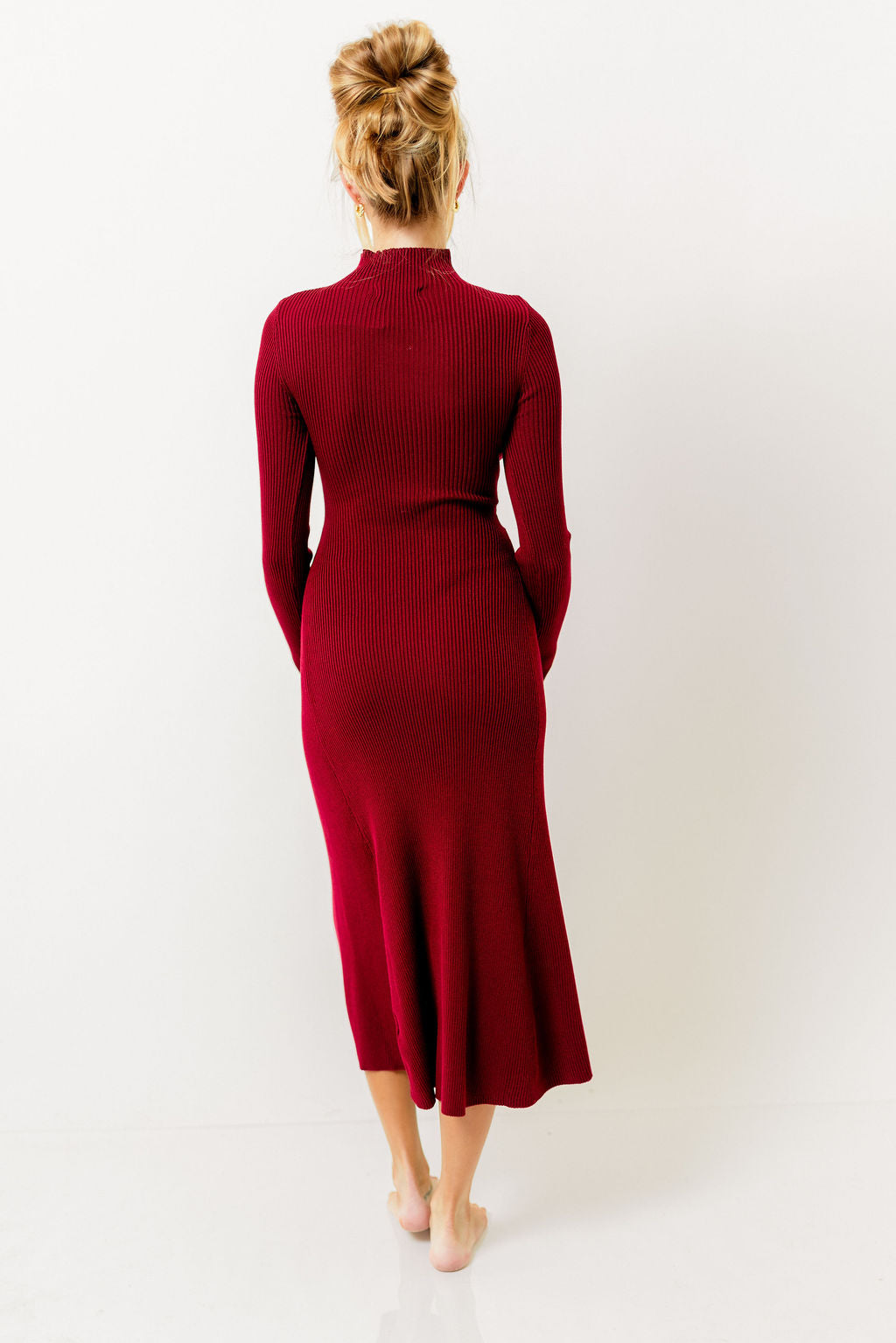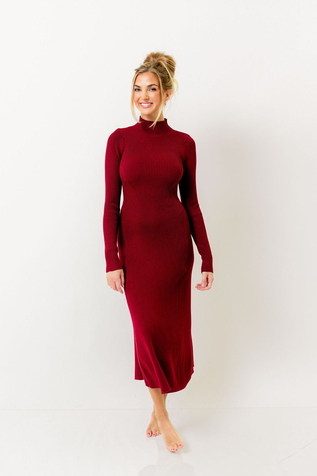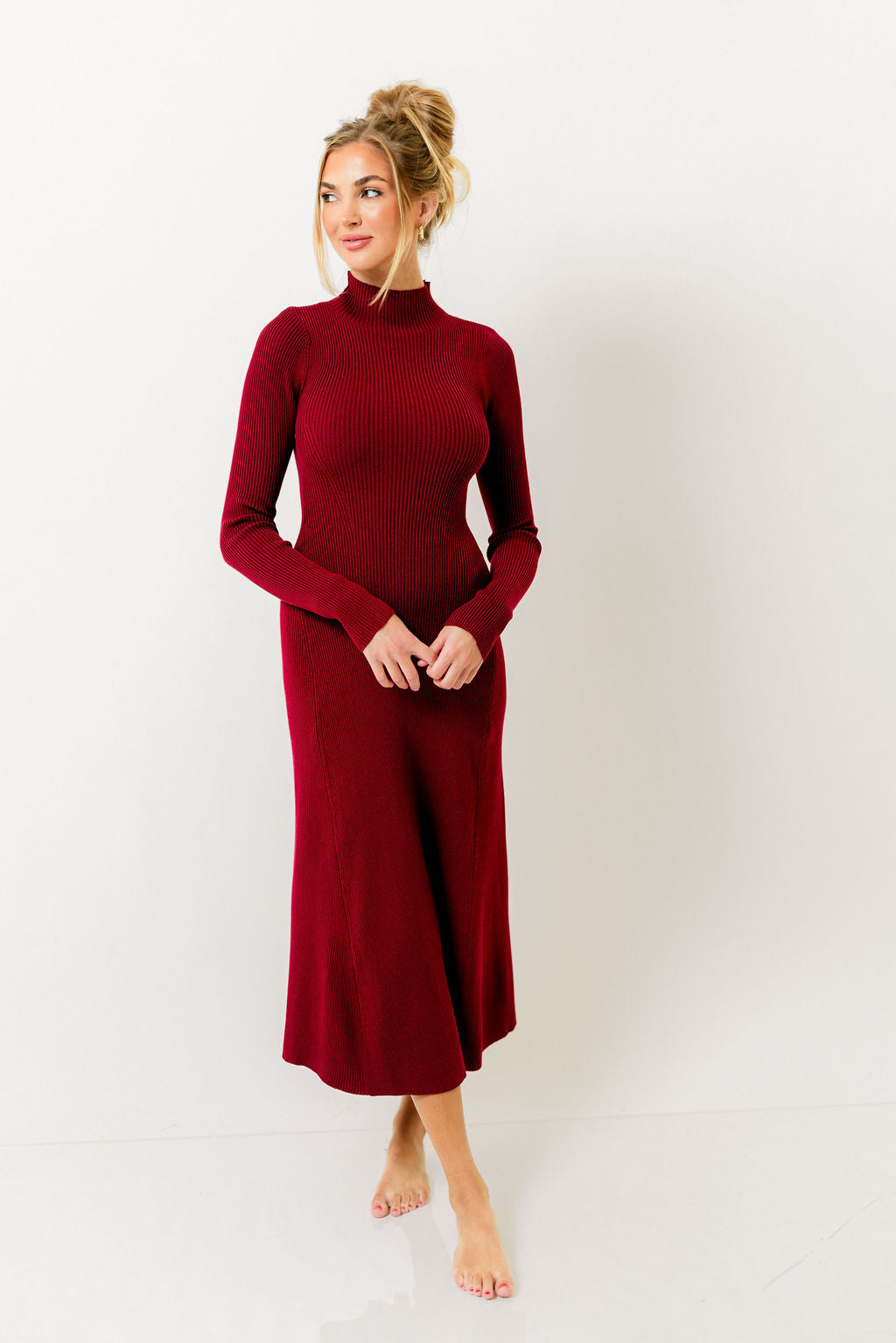Hope Mock Neck Long Sleeve Rib Knit Flared Midi Dress in Burgundy