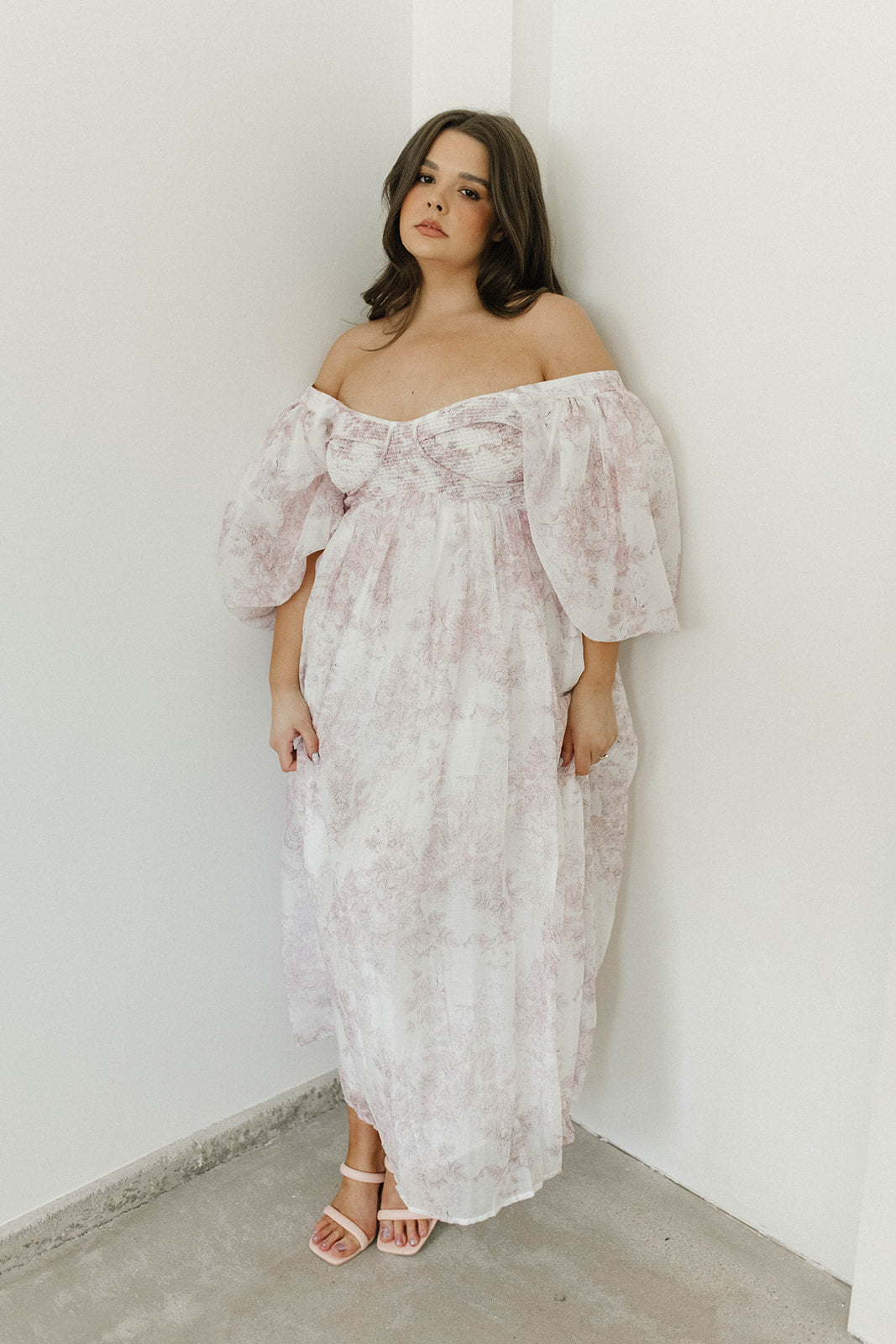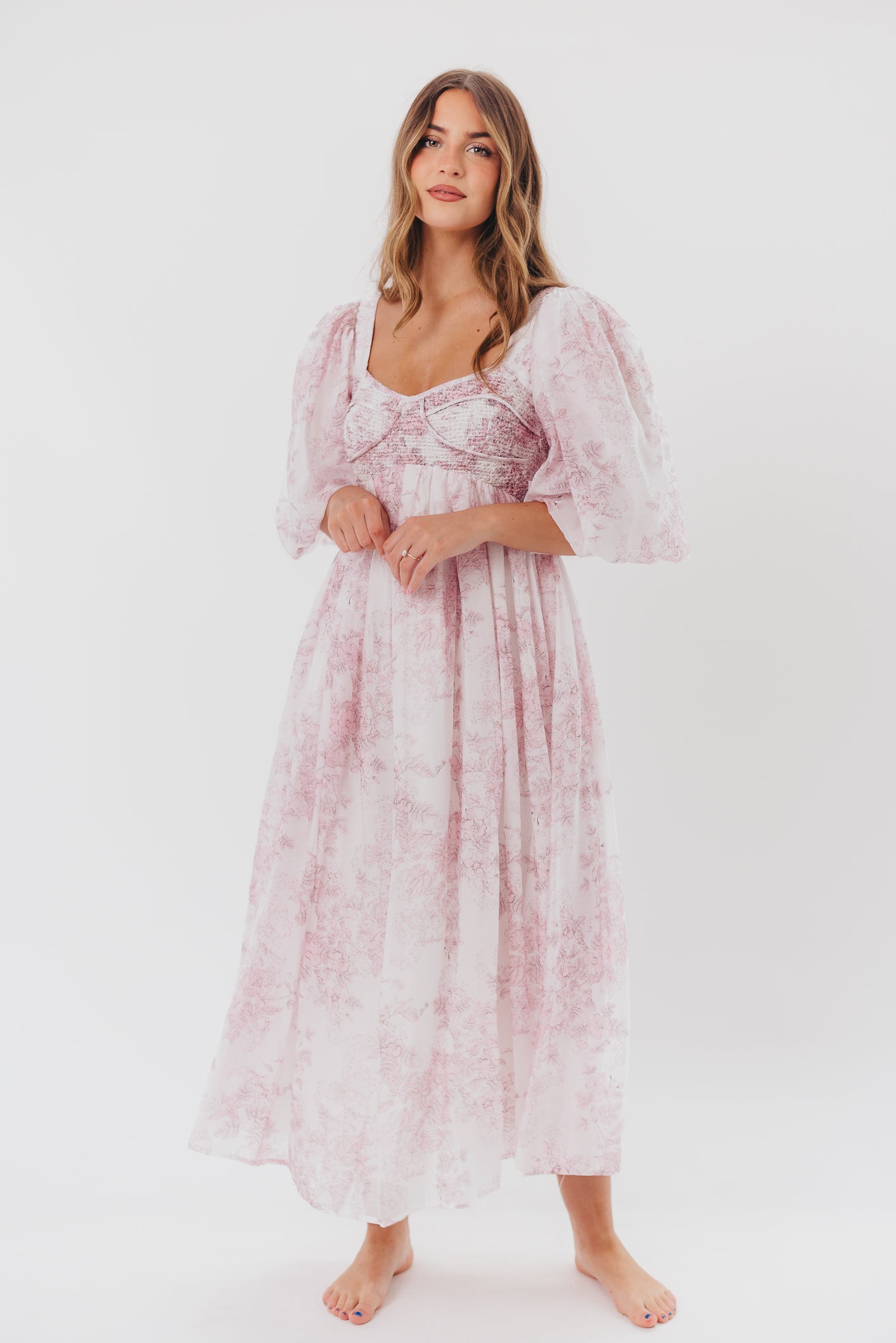 GARMENT DETAILS: Lightweight maxi in a pastel floral print. Features an empire waist silhouette and structured bustier-style bodice, with smocking in the back. Finished with statement puffed sleeves, voluminous skirt, and back zipper. Lined.