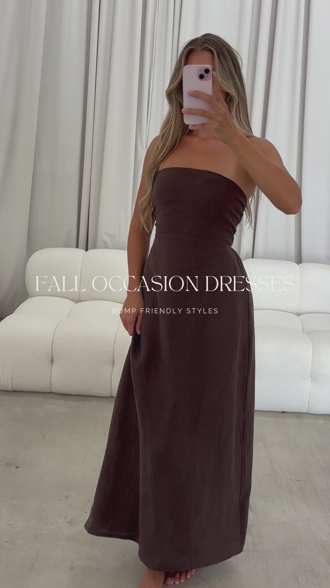 GARMENT DETAILS: Premium linen maxi dress with strapless neckline, cinched waist, and smocked back panel for comfort.