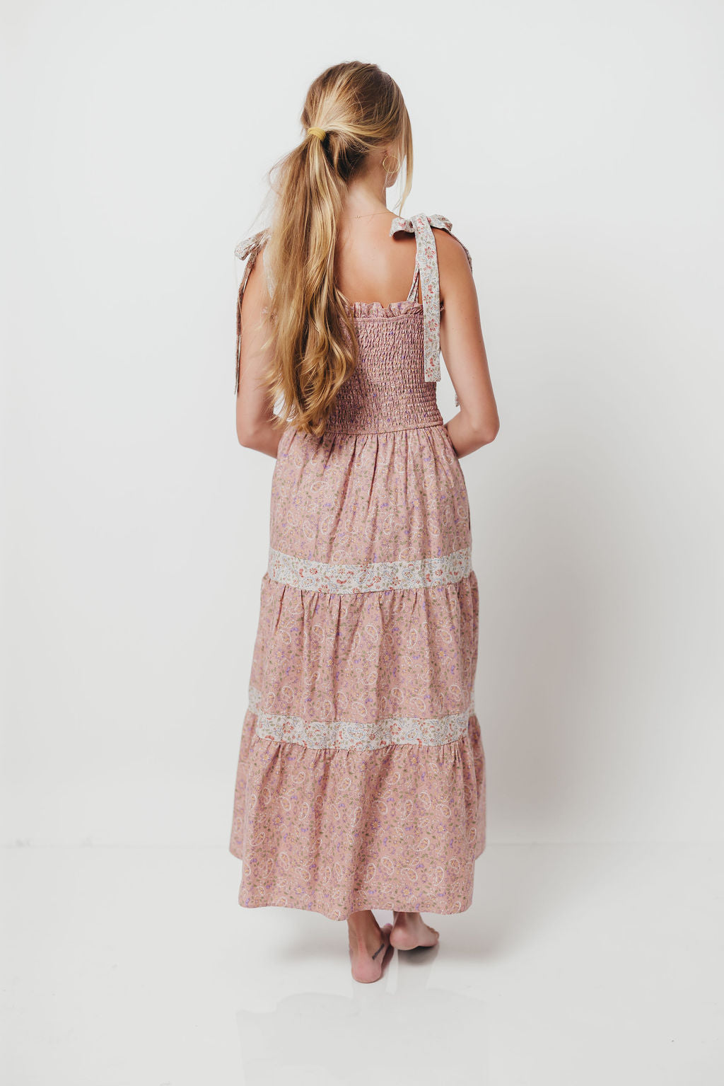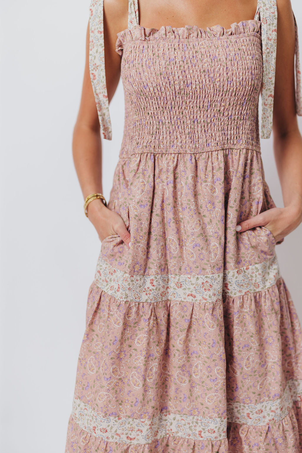 Nya 100% Cotton Smocked Midi Dress in Beige/Red Floral