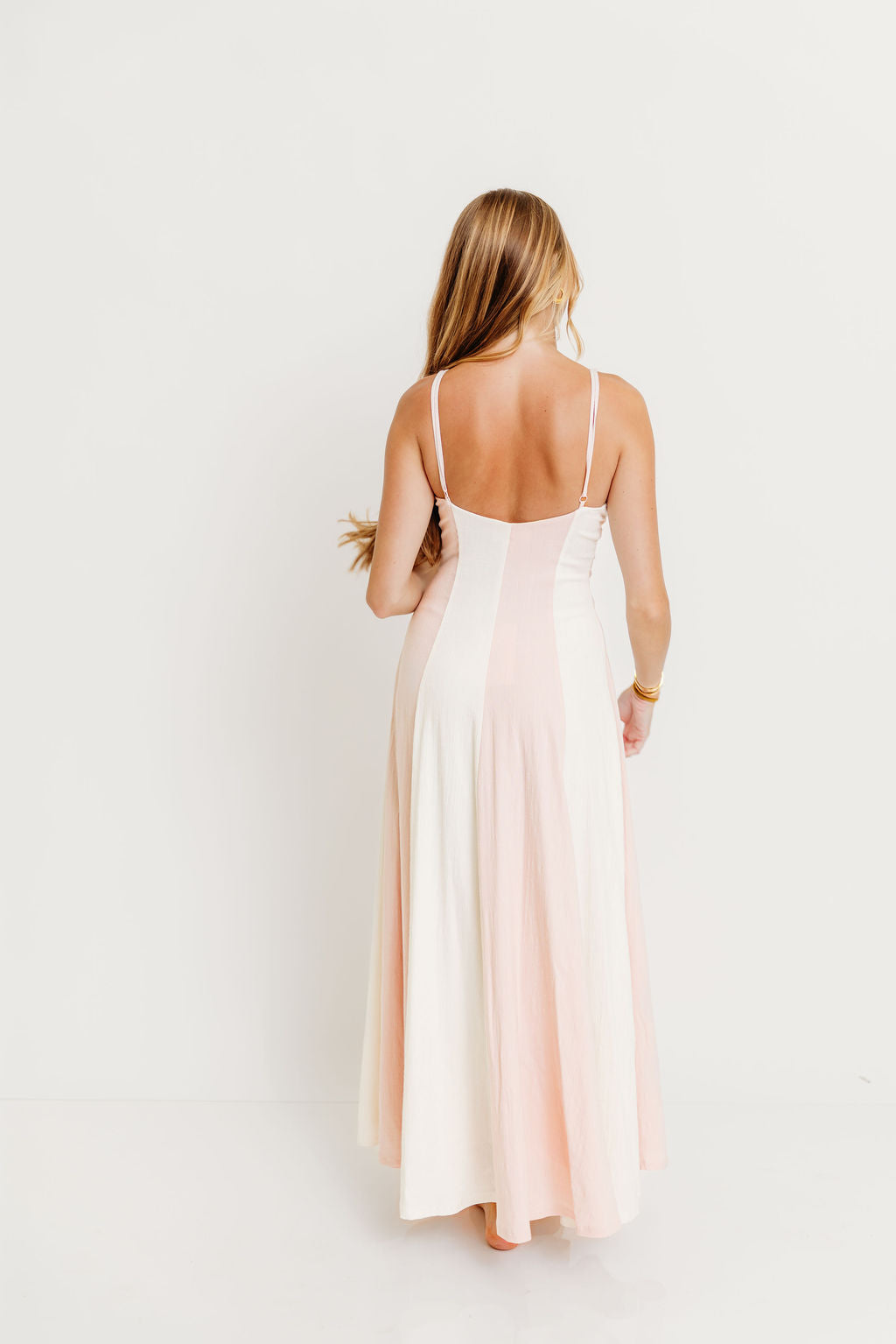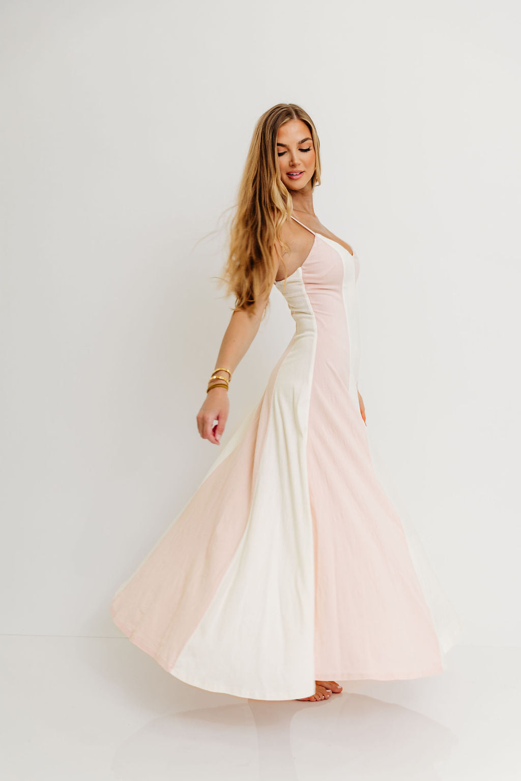 Cher Vertical Striped V-Neck Flare Maxi Dress in White/Milky Pink
