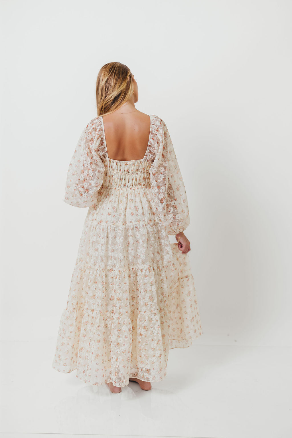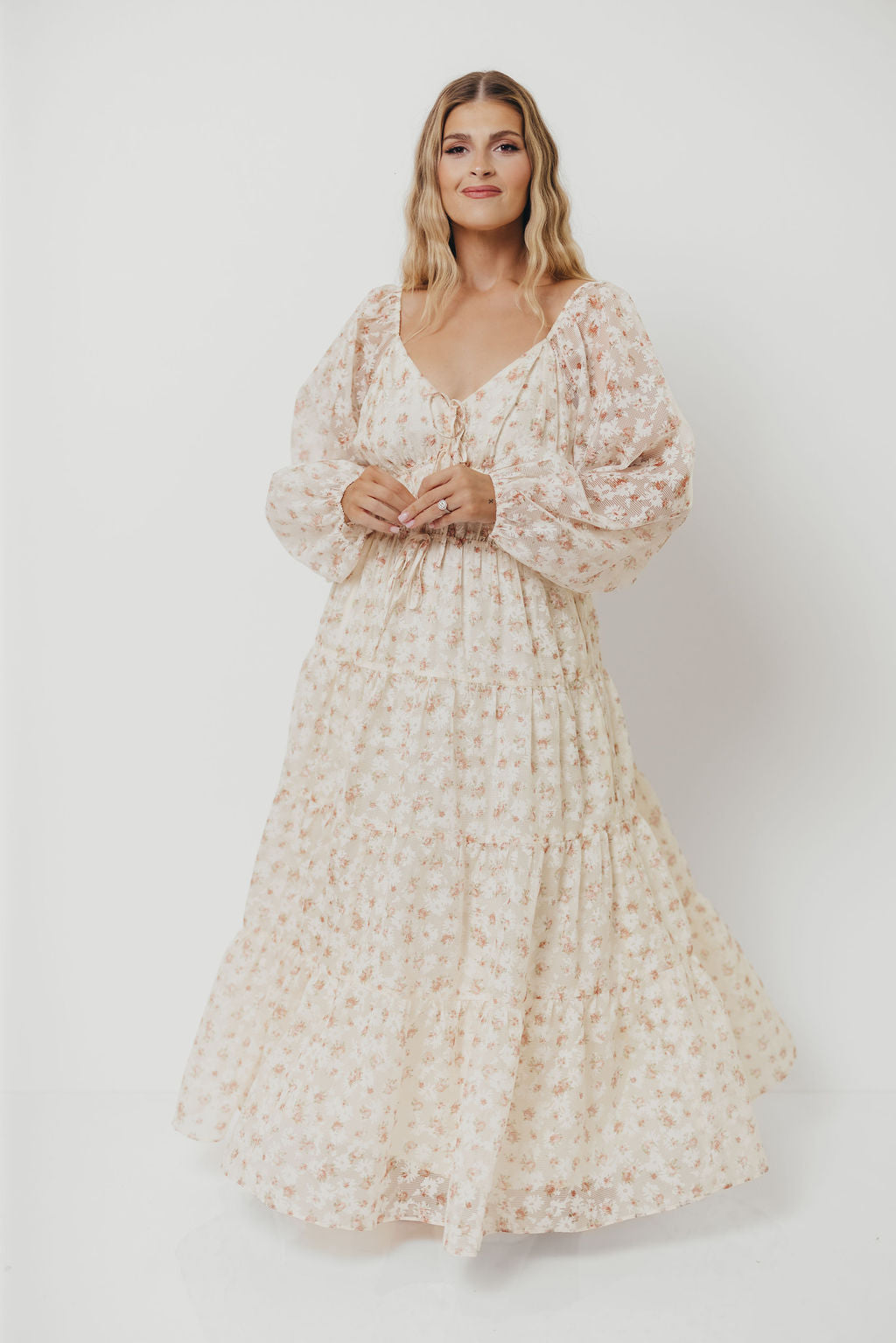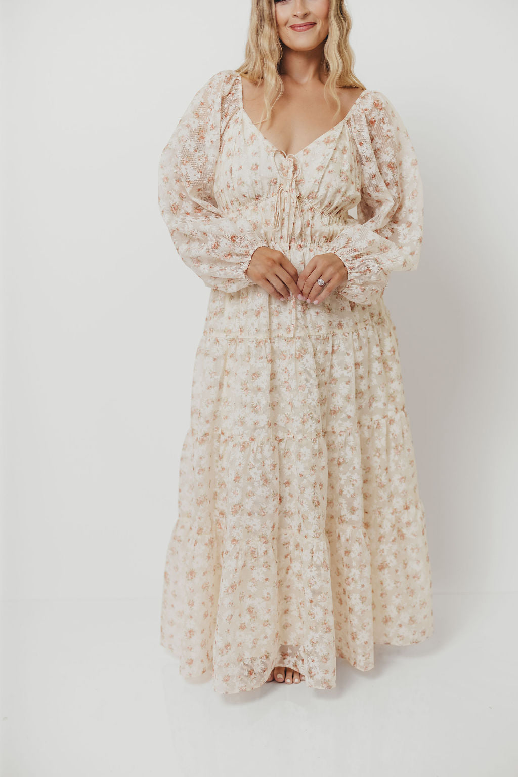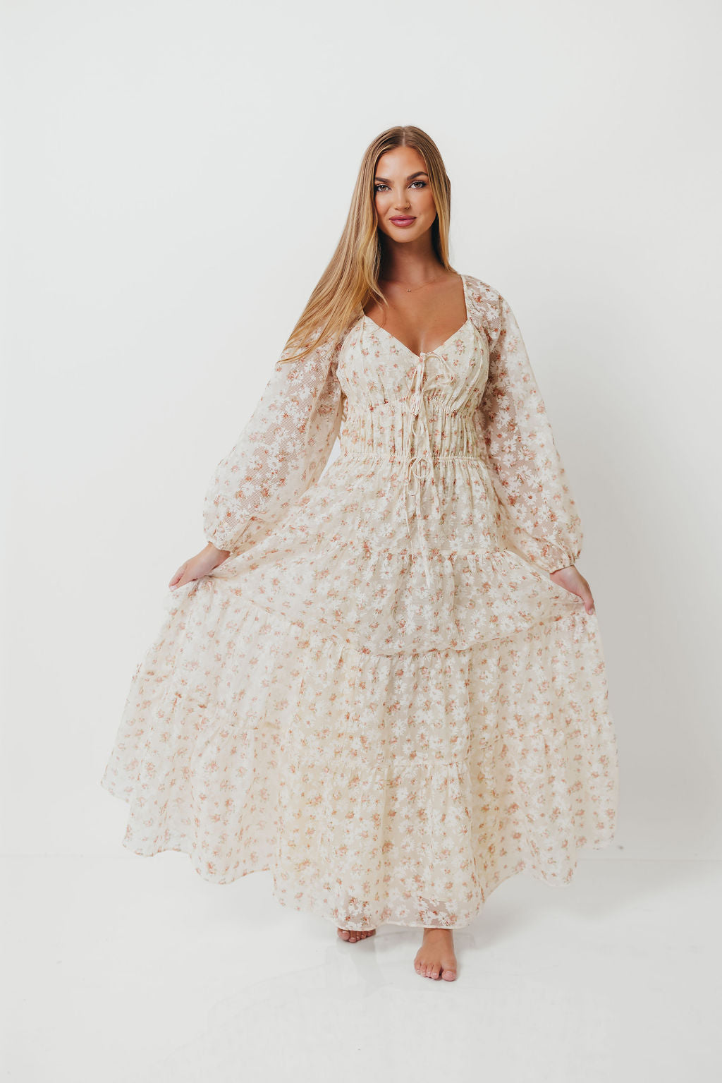 Macklynn V-Neck Long Sleeve Tier Maxi Dress in Cream/Orange Floral