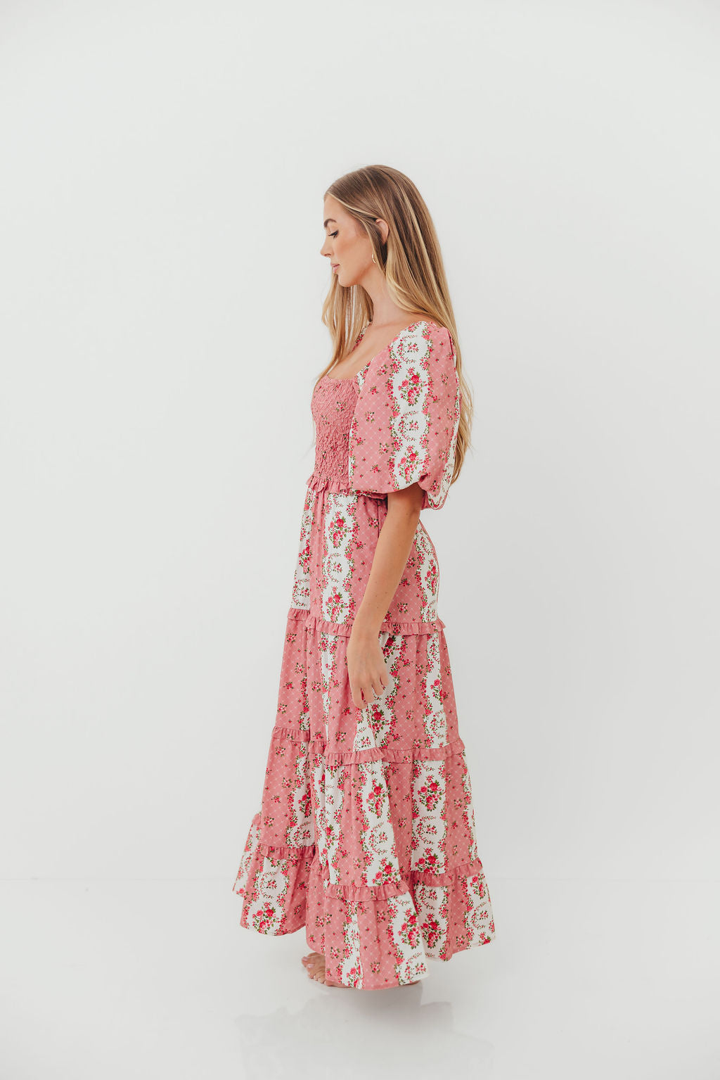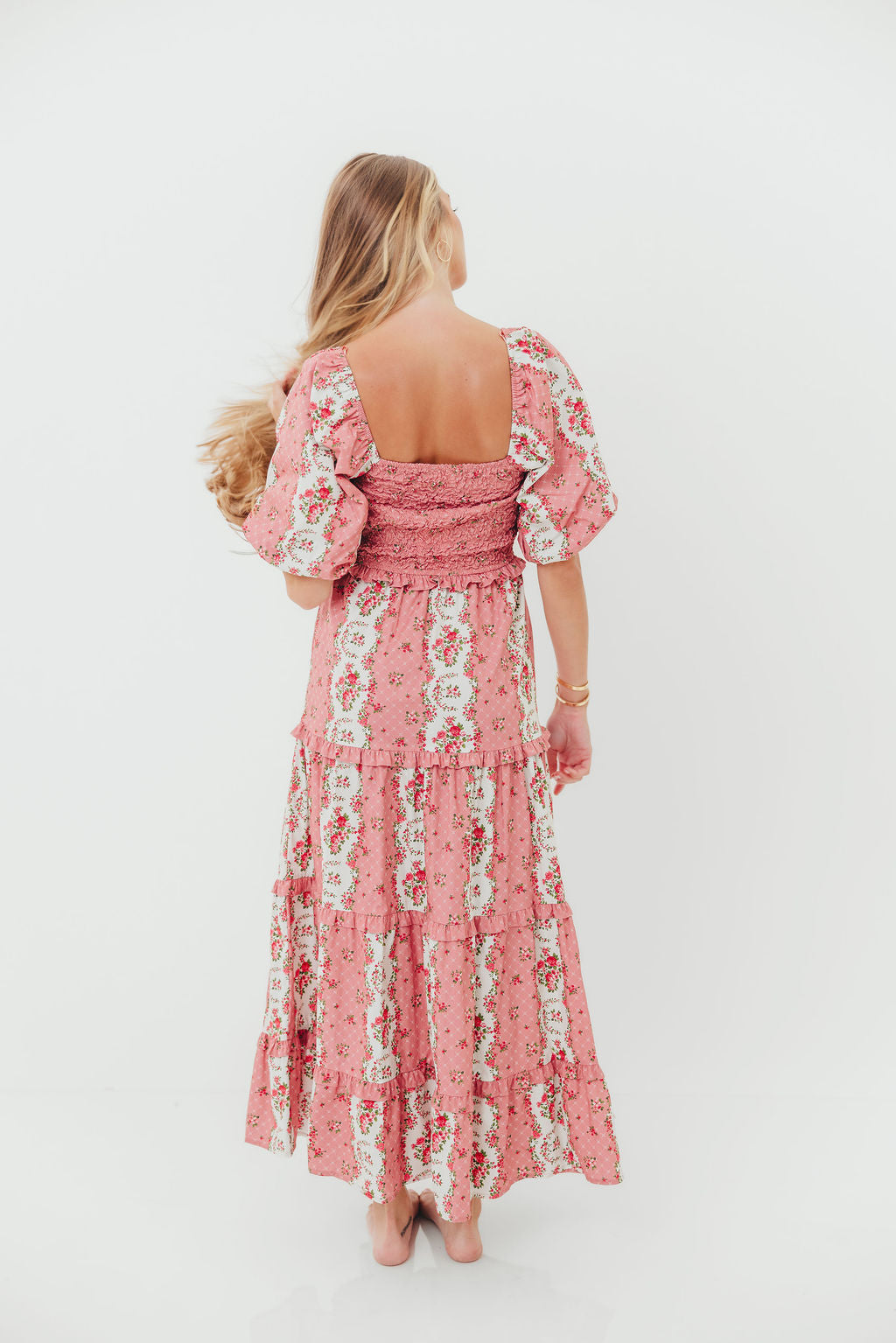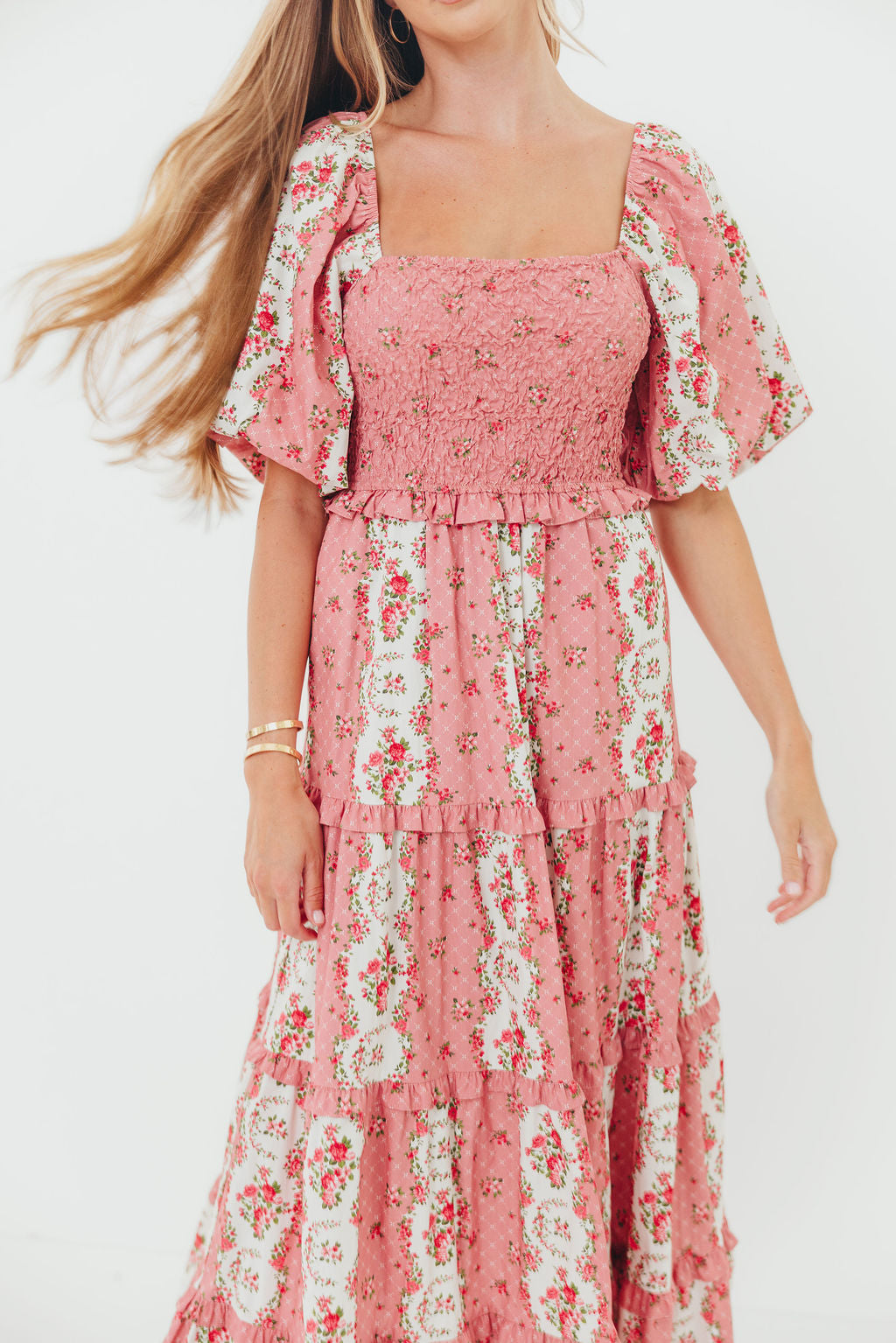 Mona Maxi Dress with Smocking in Pink/Beige Multi Floral - Bump Friendly