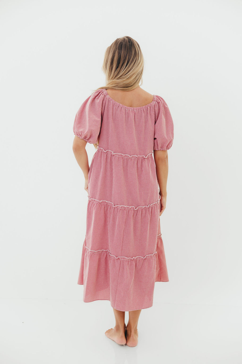 Nina 100% Cotton Gingham Tiered Midi Dress in Red/White