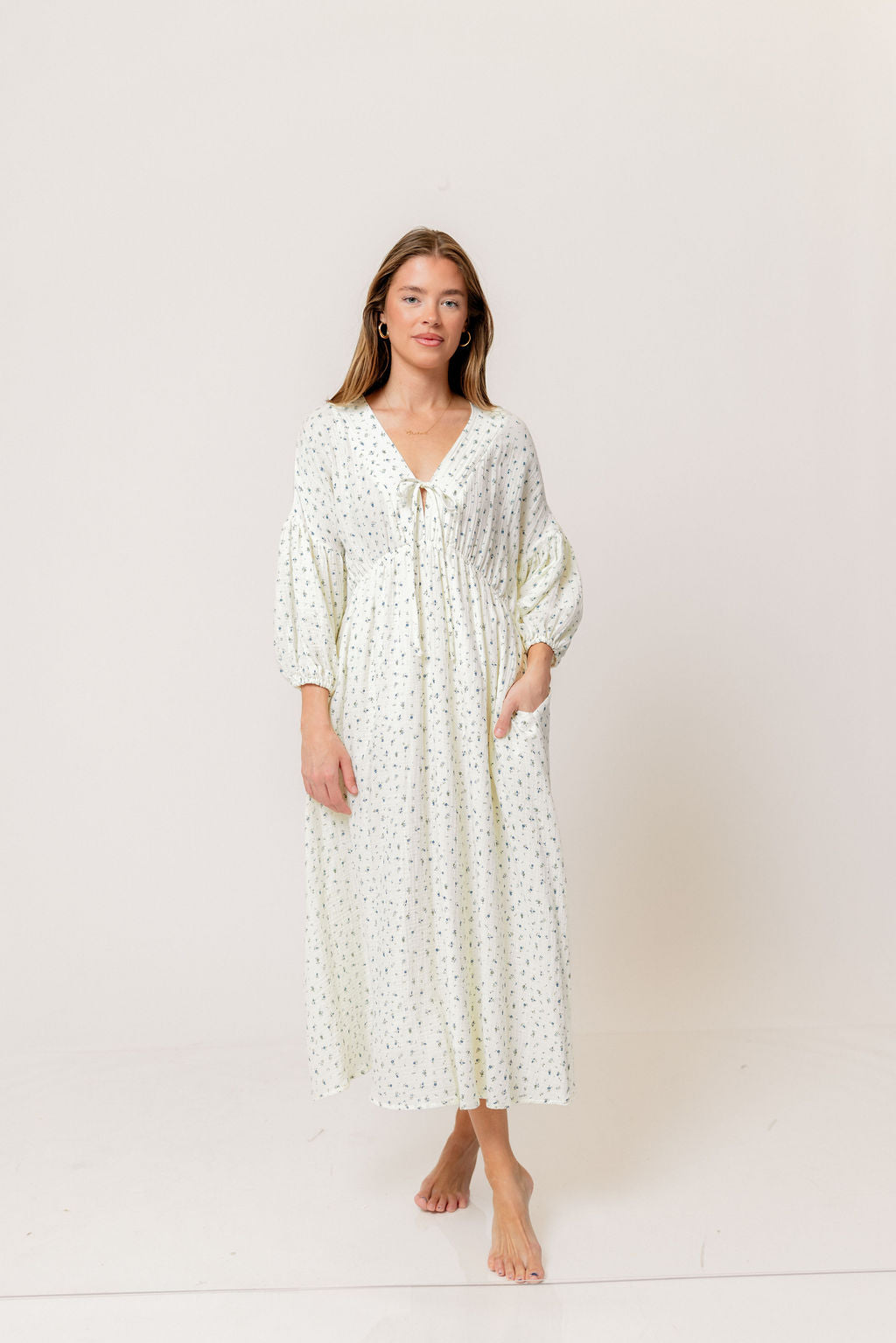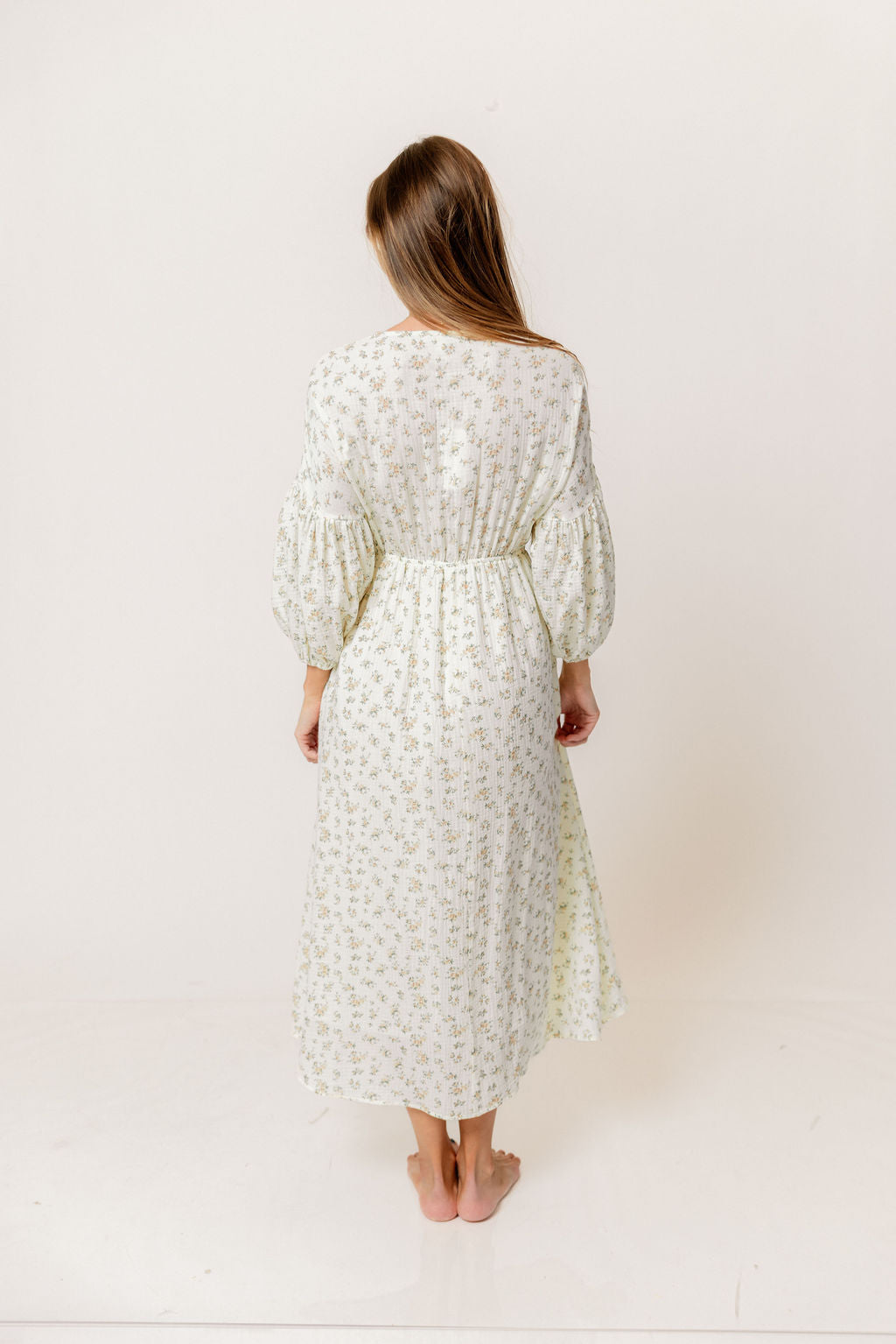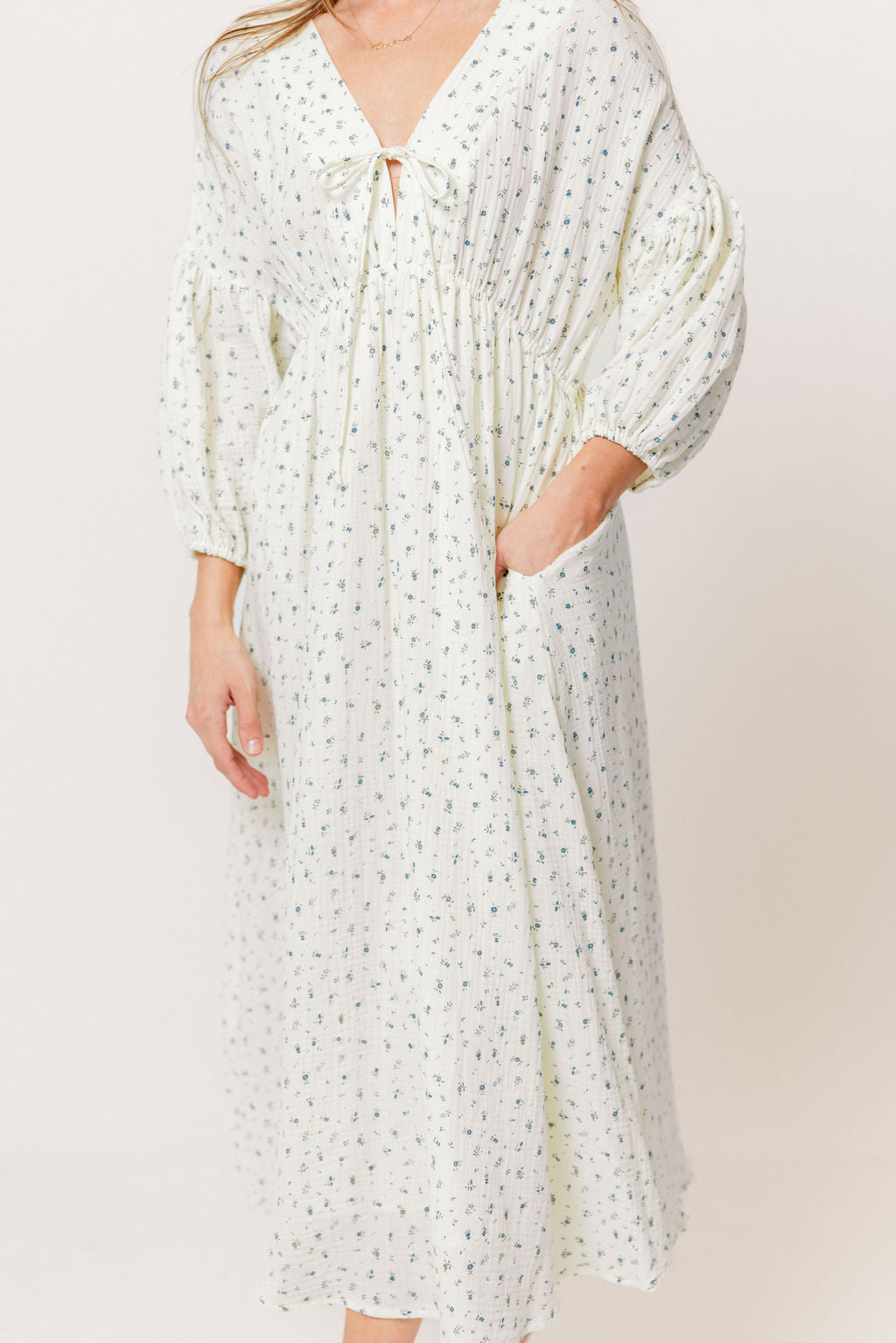 Tate 100% Cotton Floral Print Puff Sleeve Maxi Dress in Cream