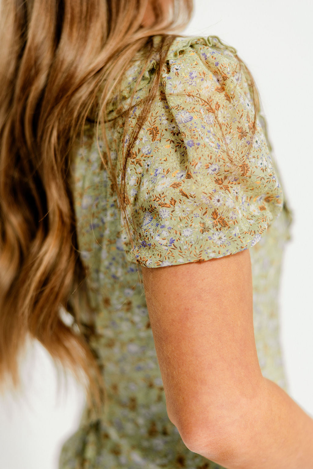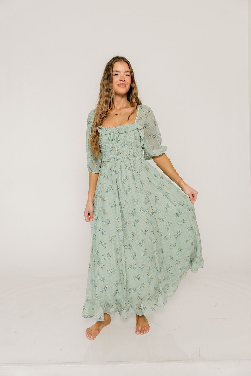 Elle Smocked Floral Ruffle Maxi Dress in Green Tea Floral