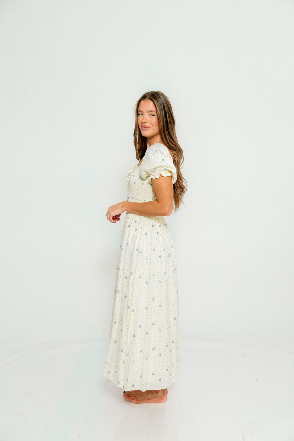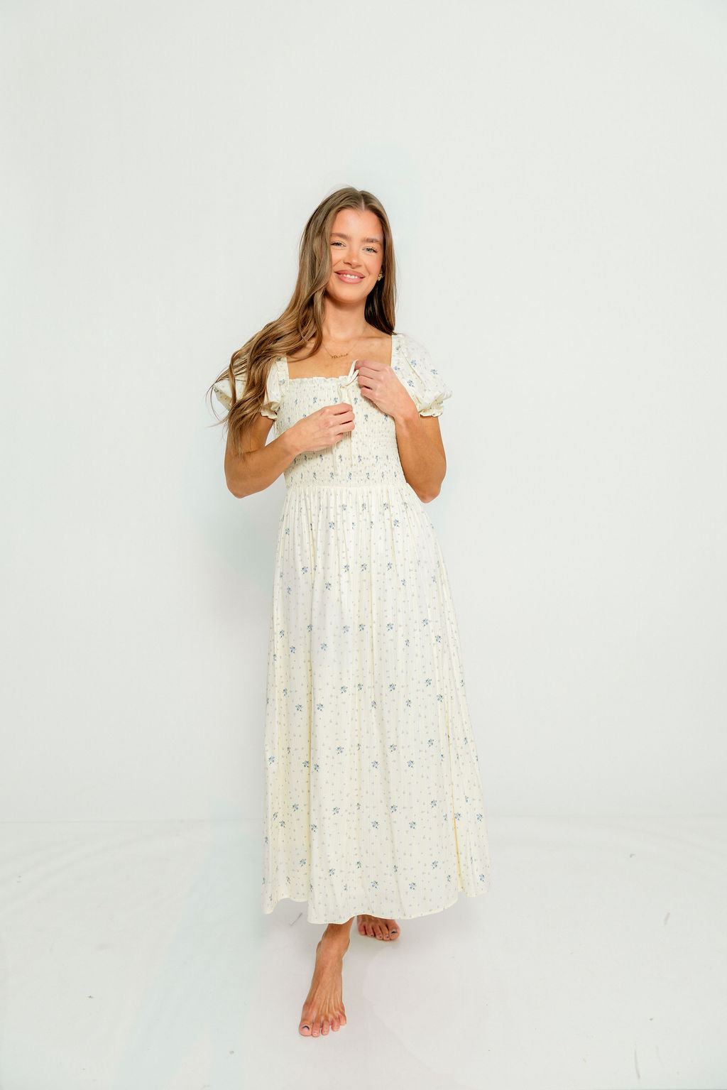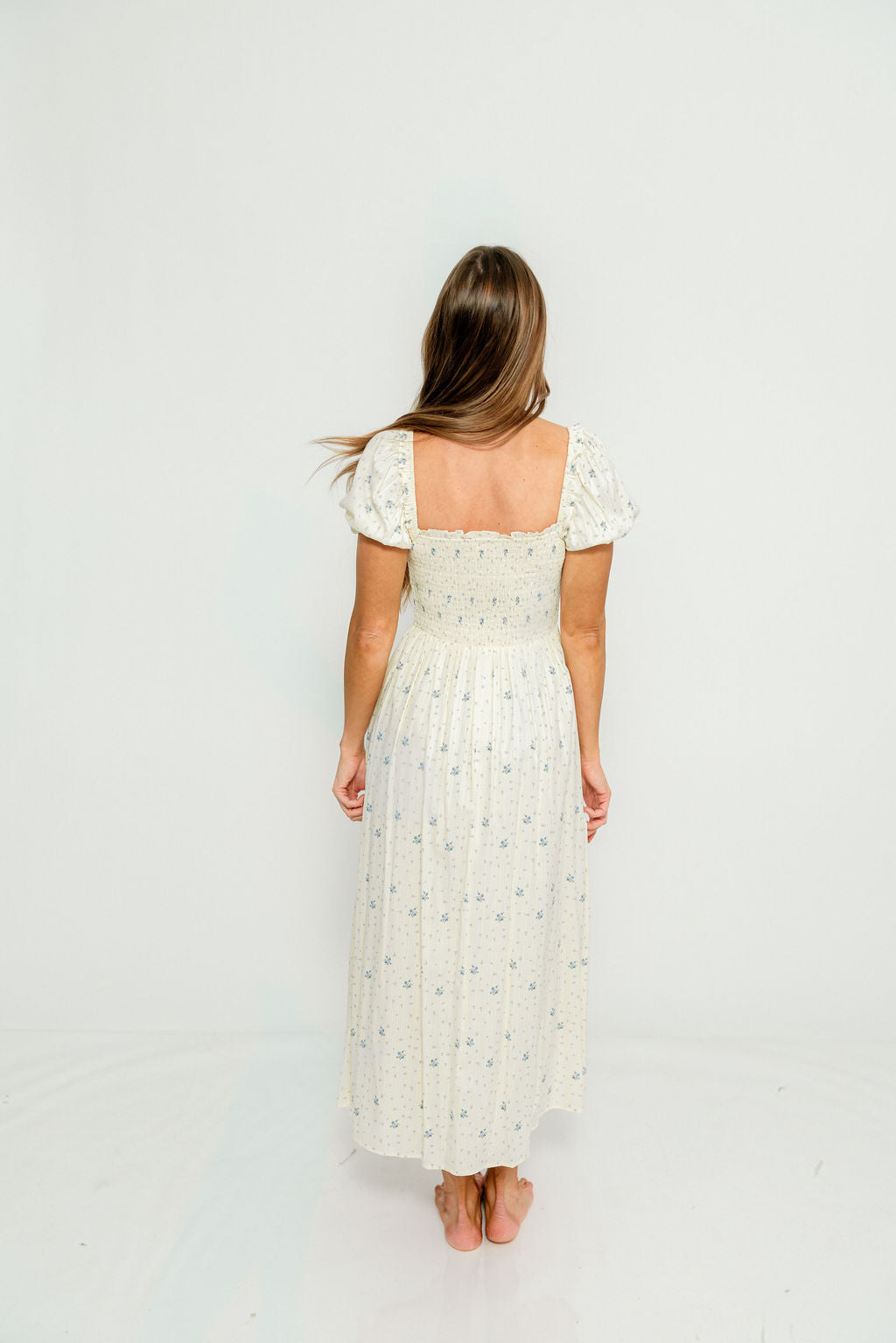 Nya 100% Cotton Smocked Midi Dress in Cream Blue Floral
