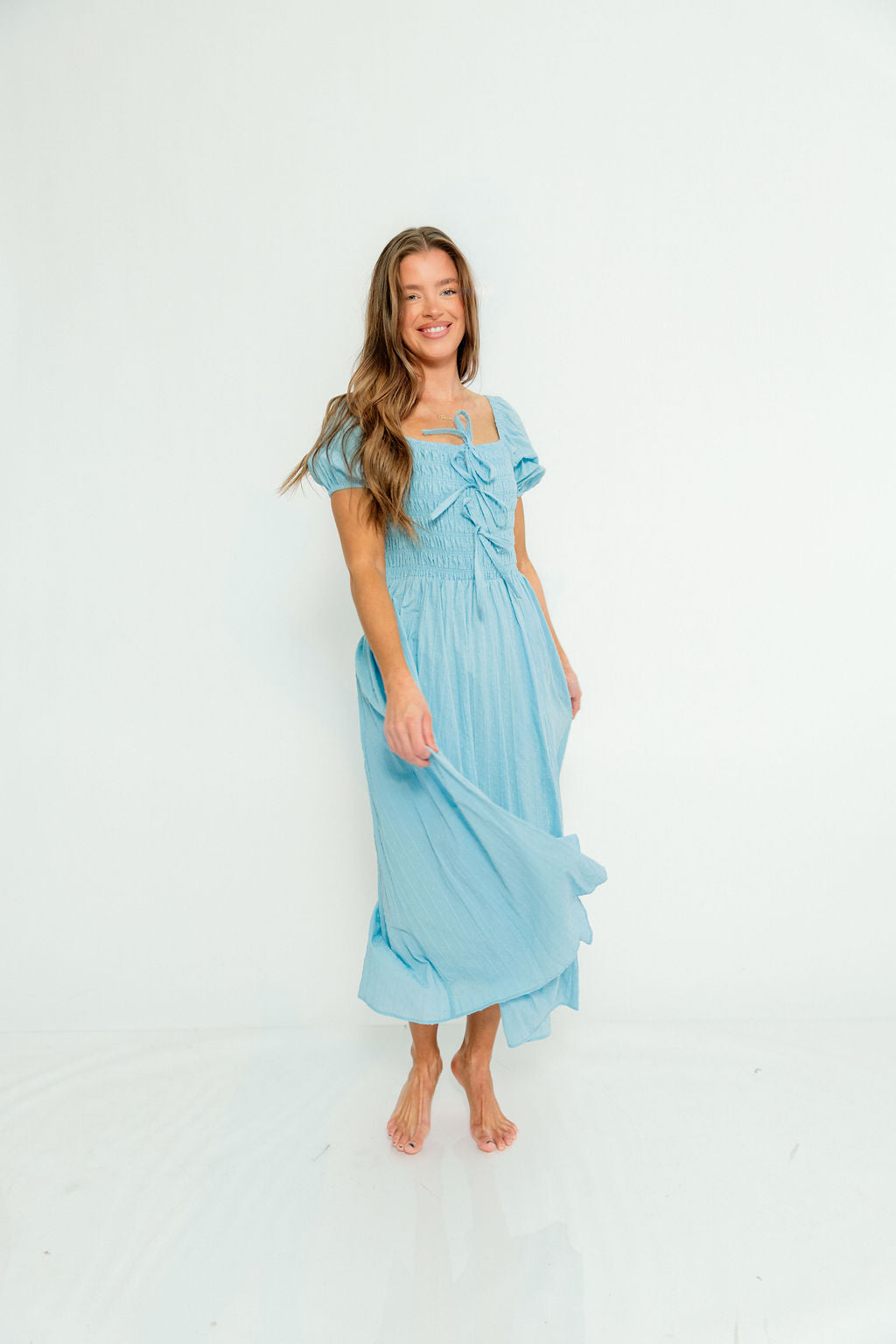 Arabelle Smocked Bow Detail Maxi Dress in Blue Aura