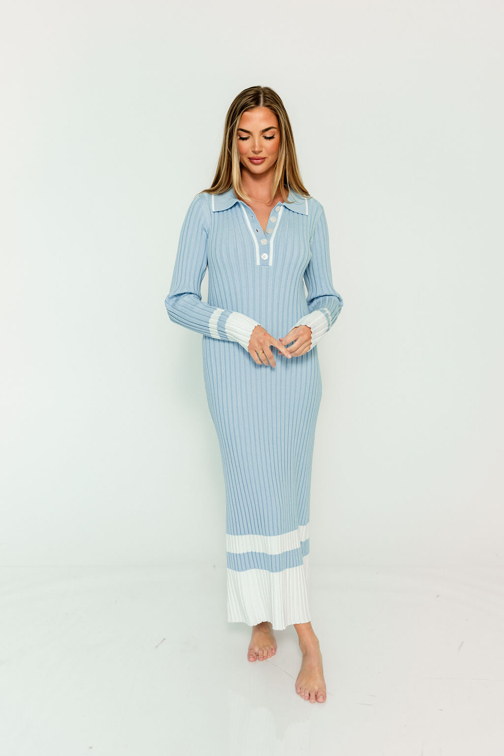 Kris Colorblock Polo Rib-Knit Maxi Dress in Sky