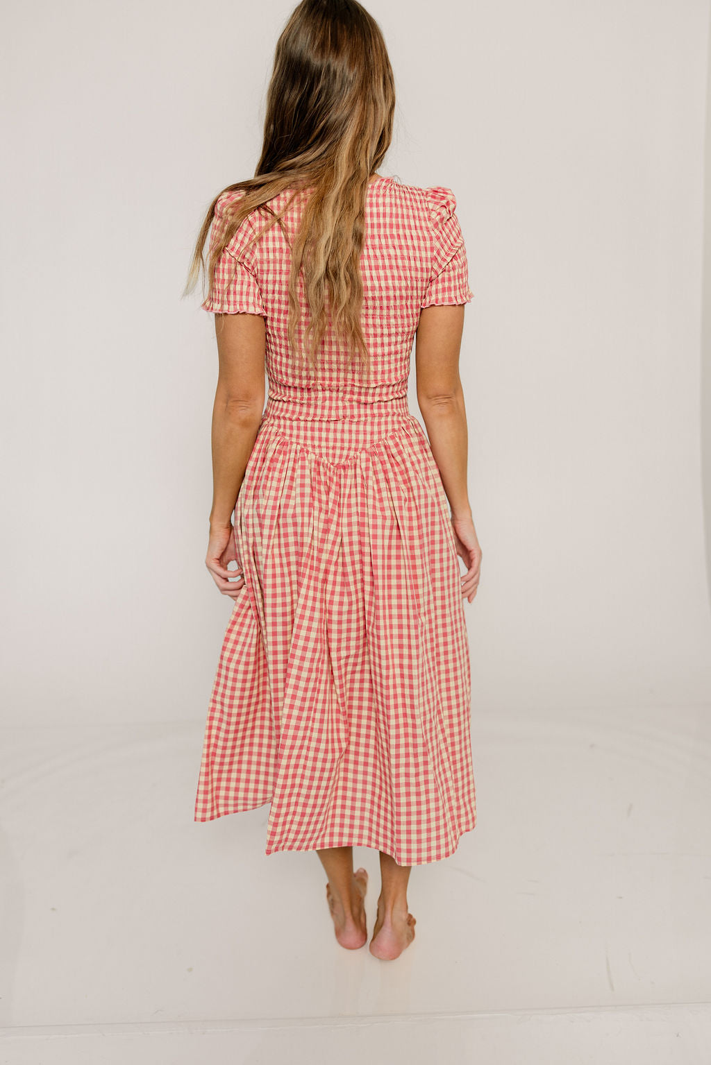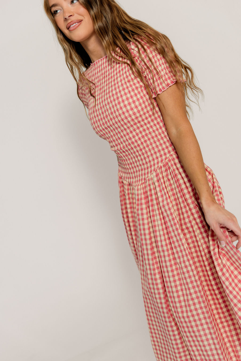 Etta 100% Cotton Smocked Gingham Midi Dress in Pink