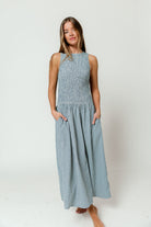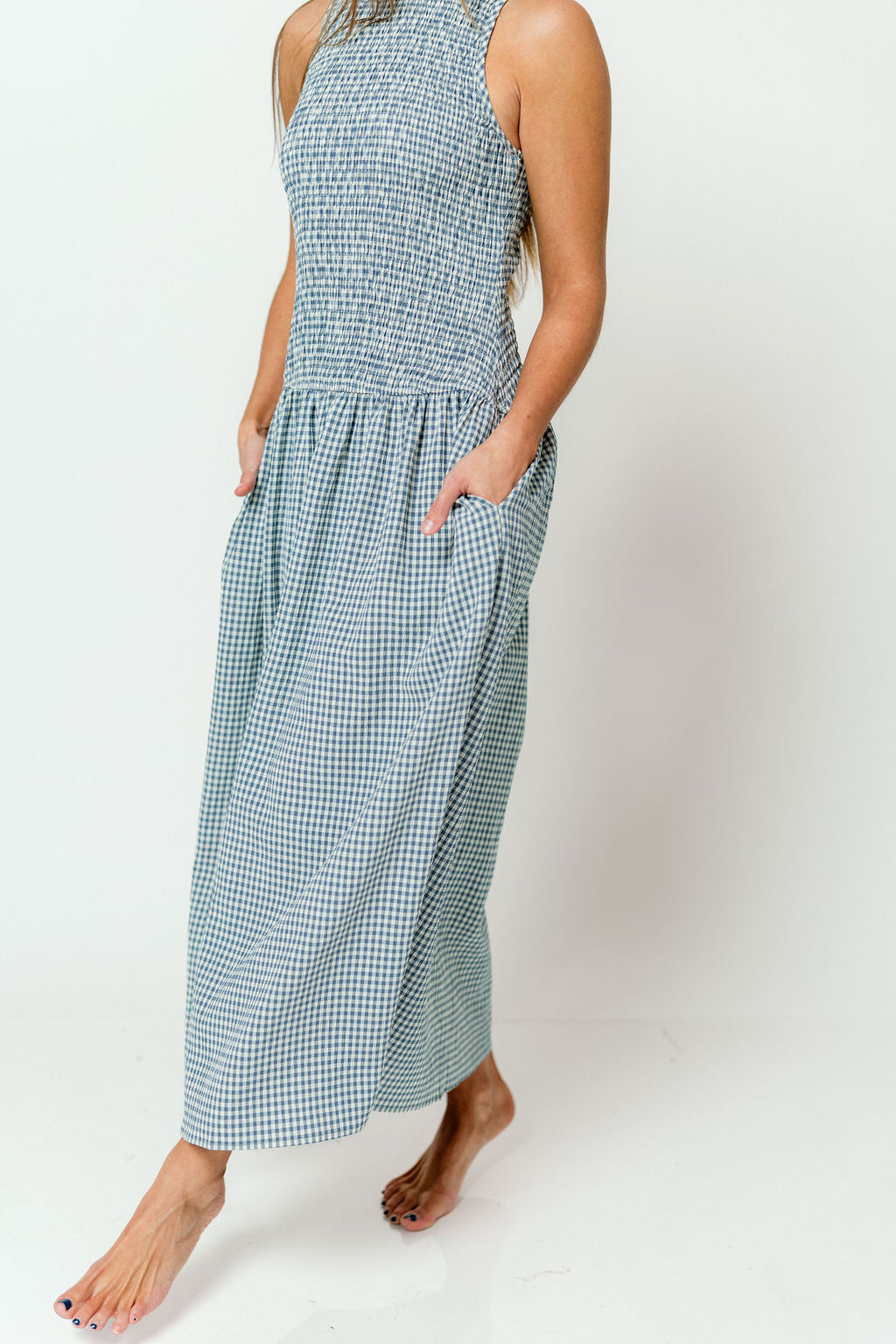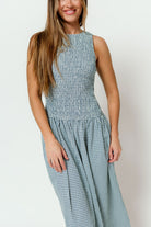 GARMENT DETAILS: Lightweight gingham-print maxi dress with stretchy, smocked bodice, dropped waist, and sleeveless design. Features a high neckline and flowy, wide skirt.