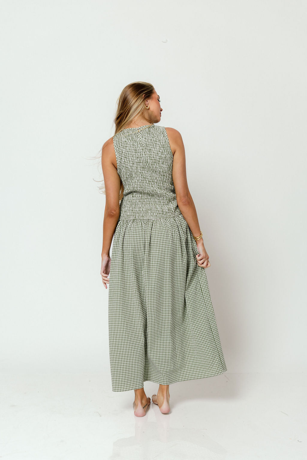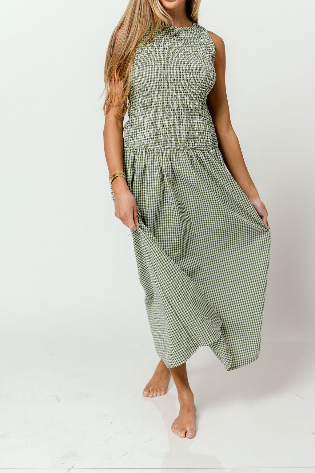 GARMENT DETAILS: Lightweight gingham-print maxi dress with stretchy, smocked bodice, dropped waist, and sleeveless design. Features a high neckline and flowy, wide skirt.