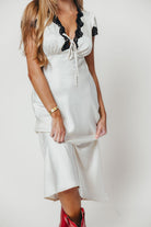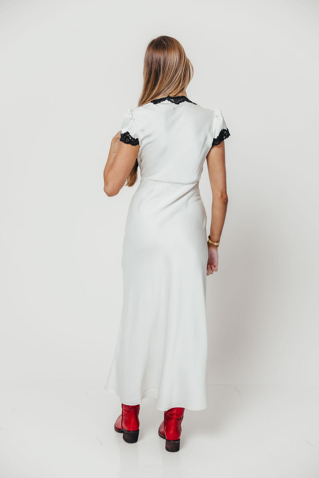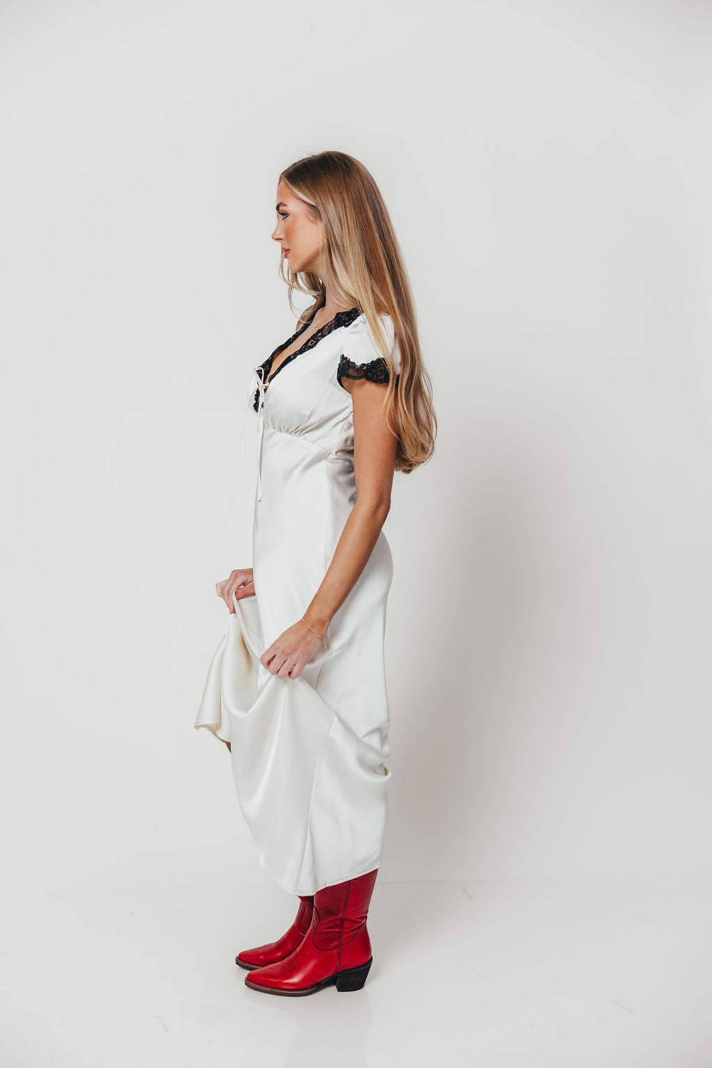 GARMENT DETAILS: Silky satin midi dress with deep V-neck, cap sleeves, and contrast color lace trim. Features a self-tie front closure, invisible side zipper, and feminine, fitted silhouette.