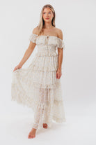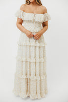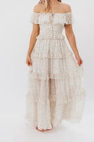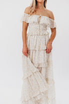 GARMENT DETAILSFloral maxi dress with self-tie detail at bust, smocked waist panel, and ruffled cap sleeves that can be worn on or off the shoulder. Lightweight skirt features ruffled tiers. Dress is lined to the 2nd ruffle from the bottom.