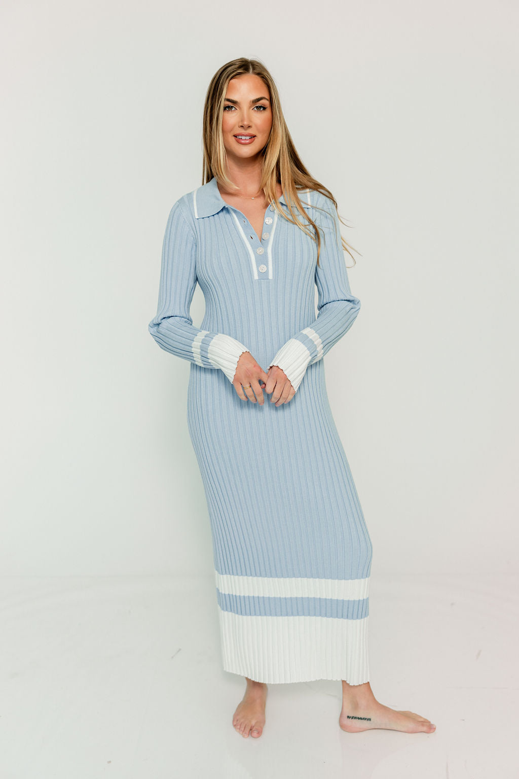 GARMENT DETAILS: Soft ribbed knit maxi dress with polo-style, collared neckline and long sleeves. Features contrast color colorblocking, chunky ribbed construction, and functional 1/4 front button placket.