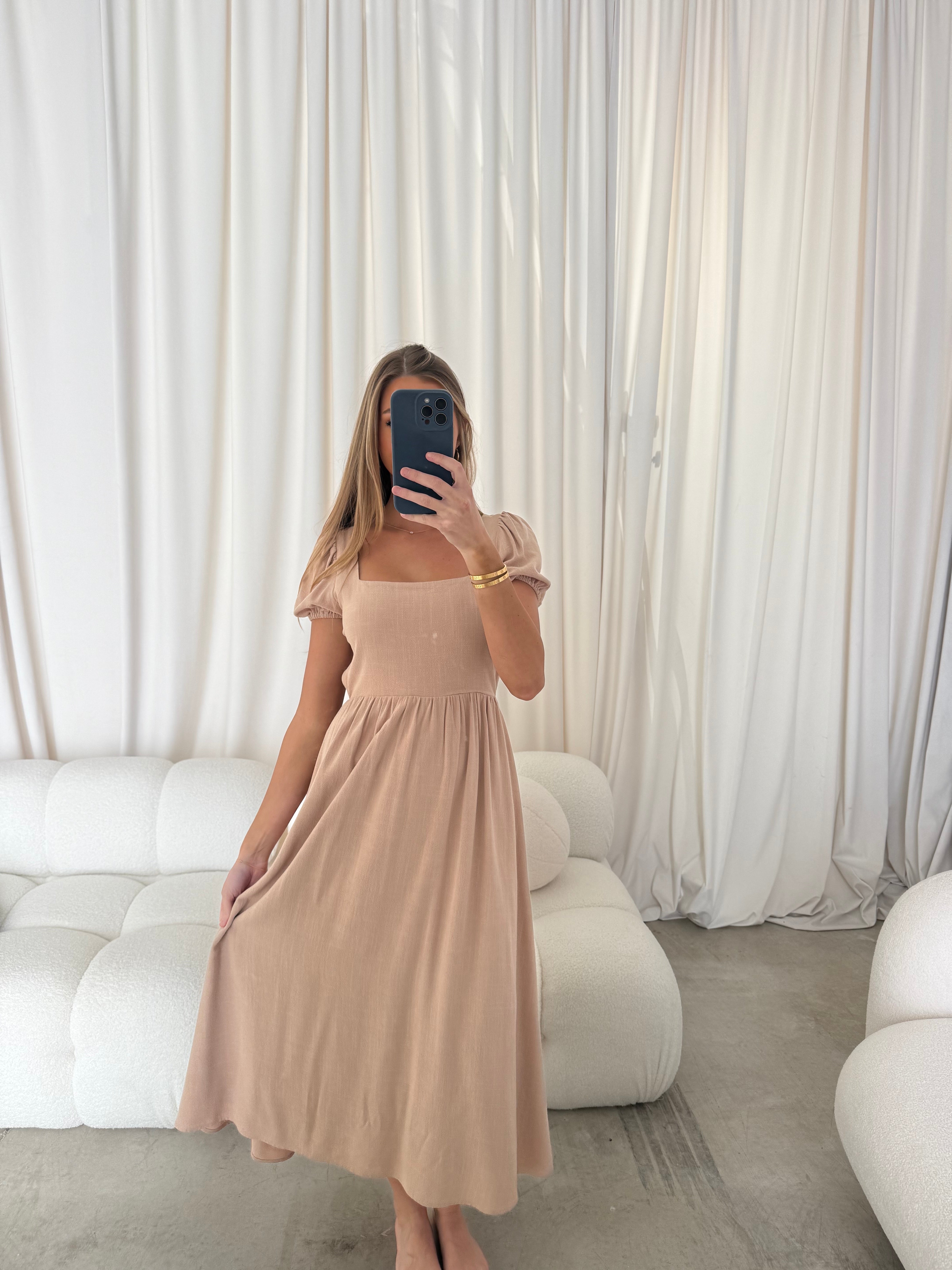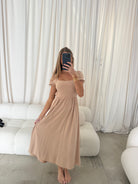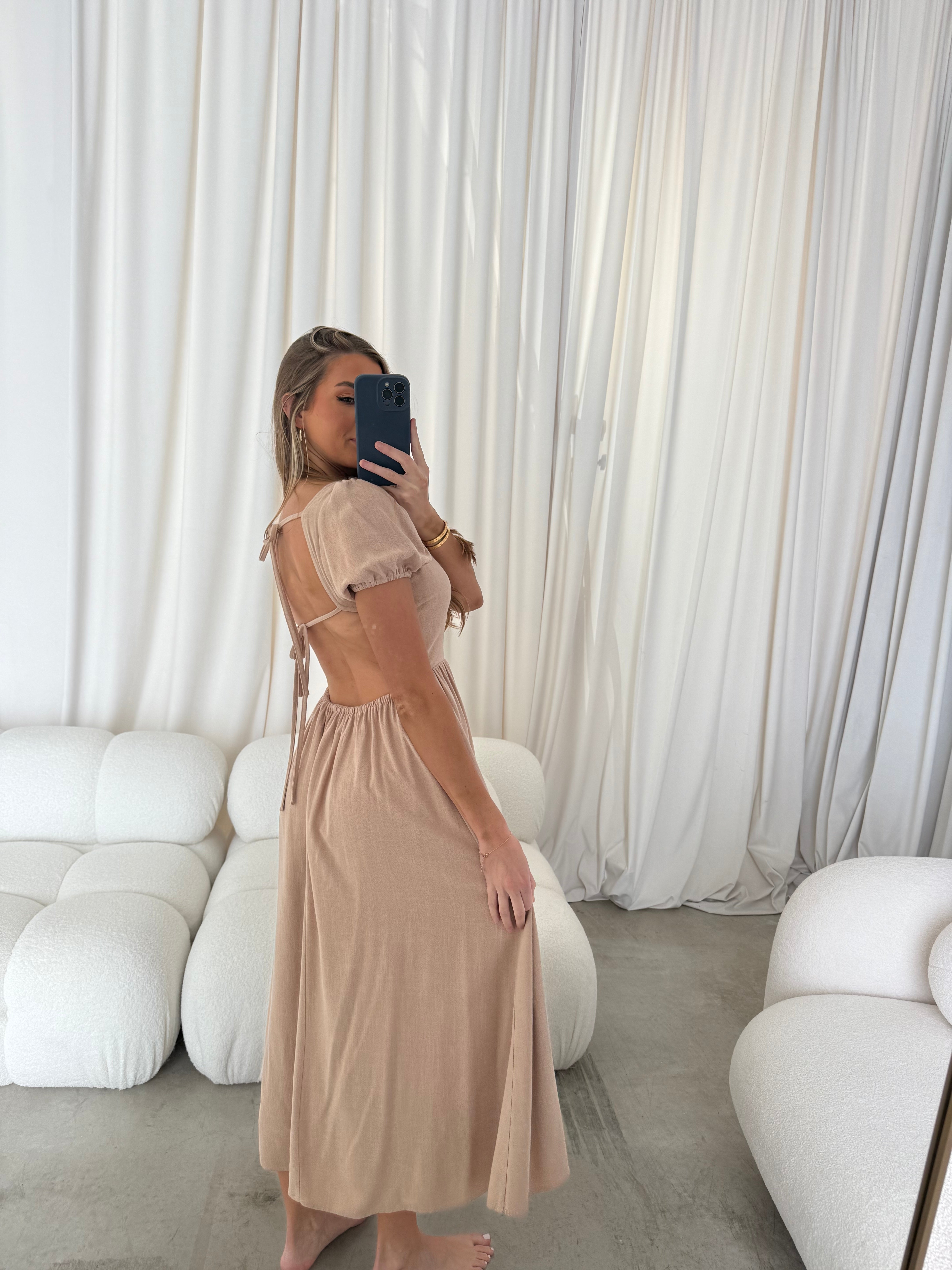 August Open Back Midi Dress in Taupe - Bump Friendly