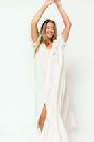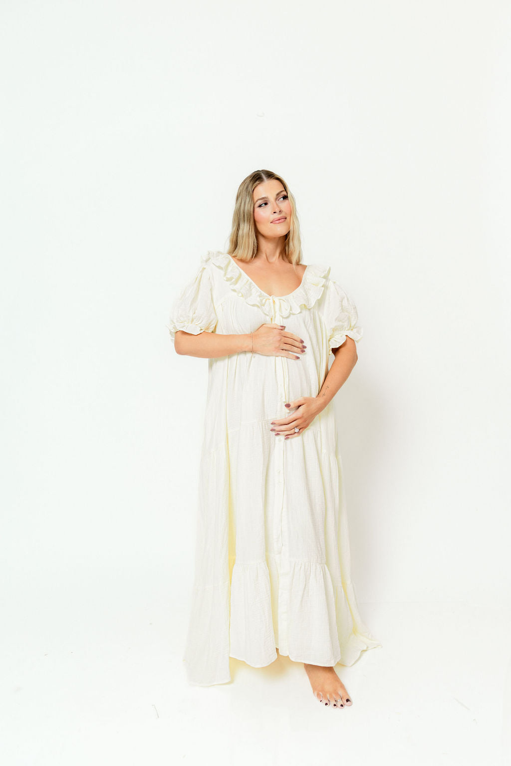 Shower your favorite mama or mama-to-be with comfort and gift them our new Sunday Maxi Dress in Cream! This stunning and ultra-versatile gown is lightweight, extra-flowy, and essentially feminine, with playful ruffled sleeves and a high front slit. It's an effortless choice for anyone and sure to be a spring and summer favorite. P.S. It makes a gorgeous going-home outfit after baby is born!