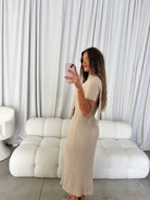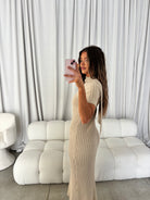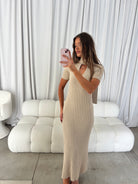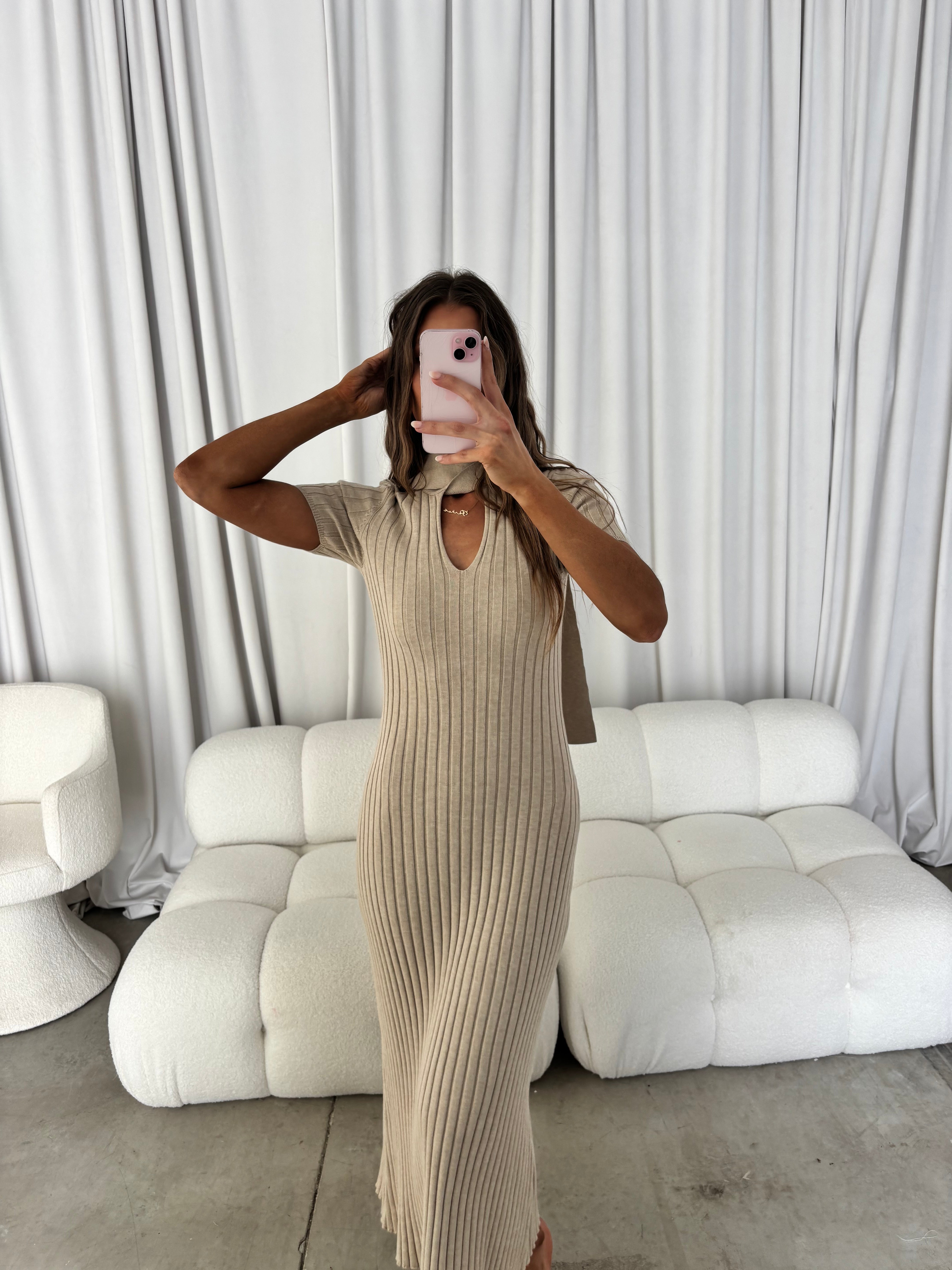Rebecca Bow Detail Rib-Knit Maxi Dress in Oatmeal
