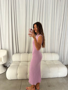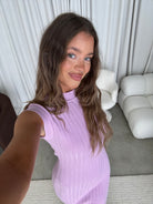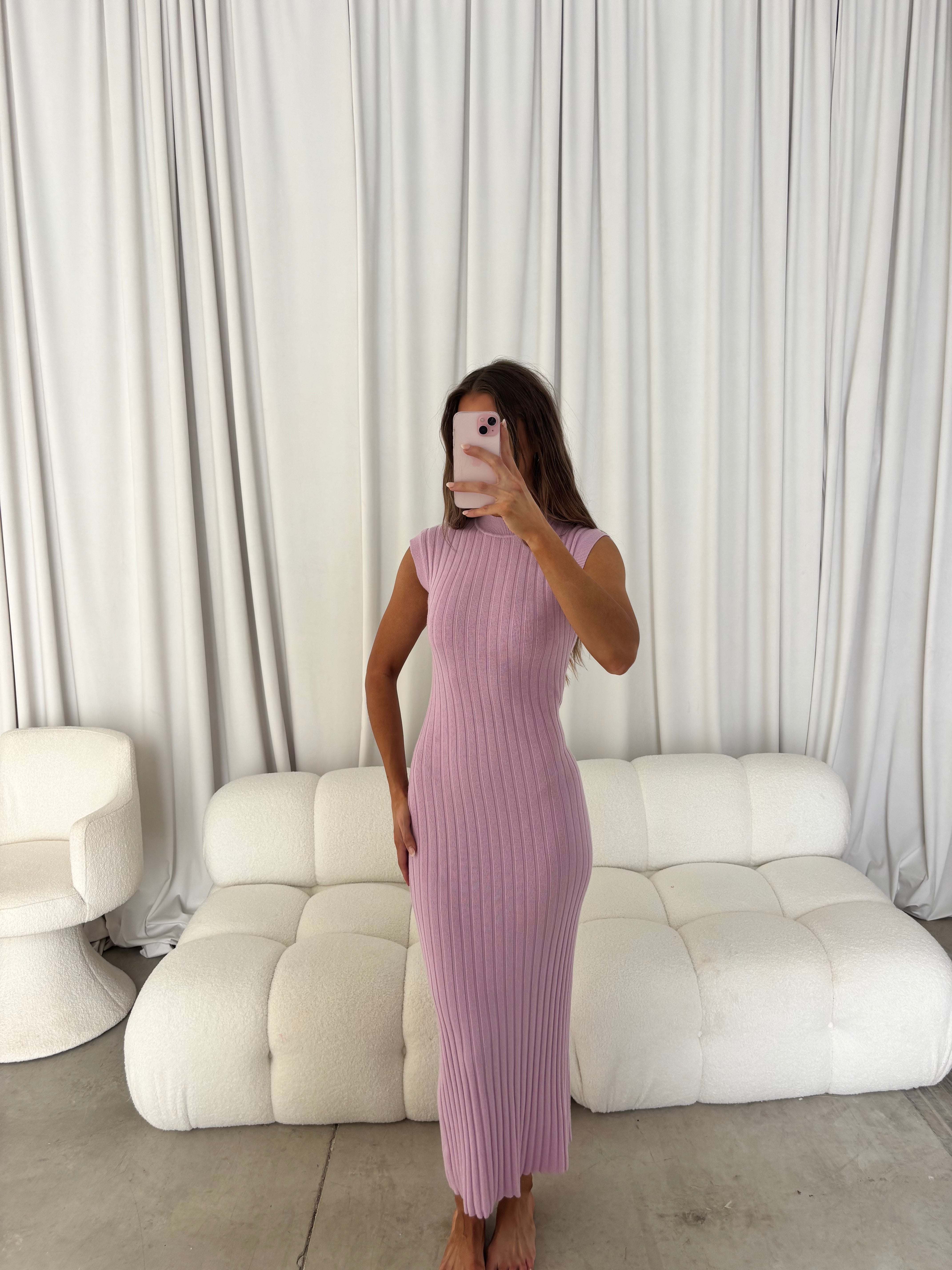 GARMENT DETAILS: Luxurious ribbed knit maxi dress with elegant mockneck, cap sleeves, and a fitted, feminine silhouette.