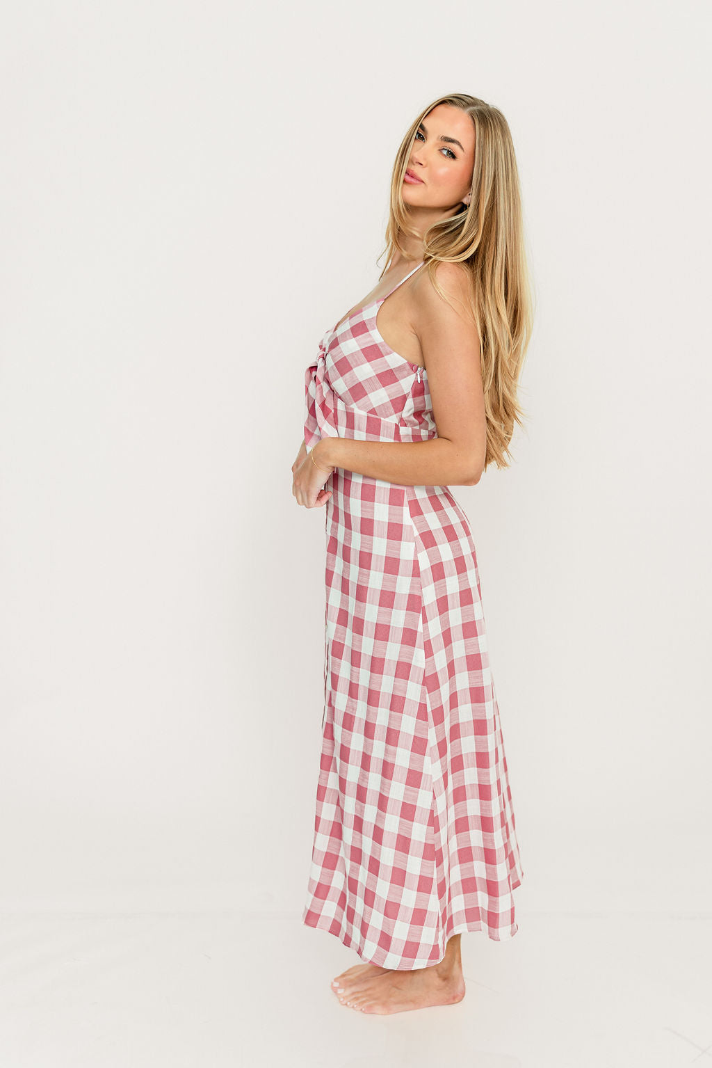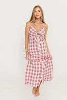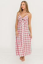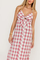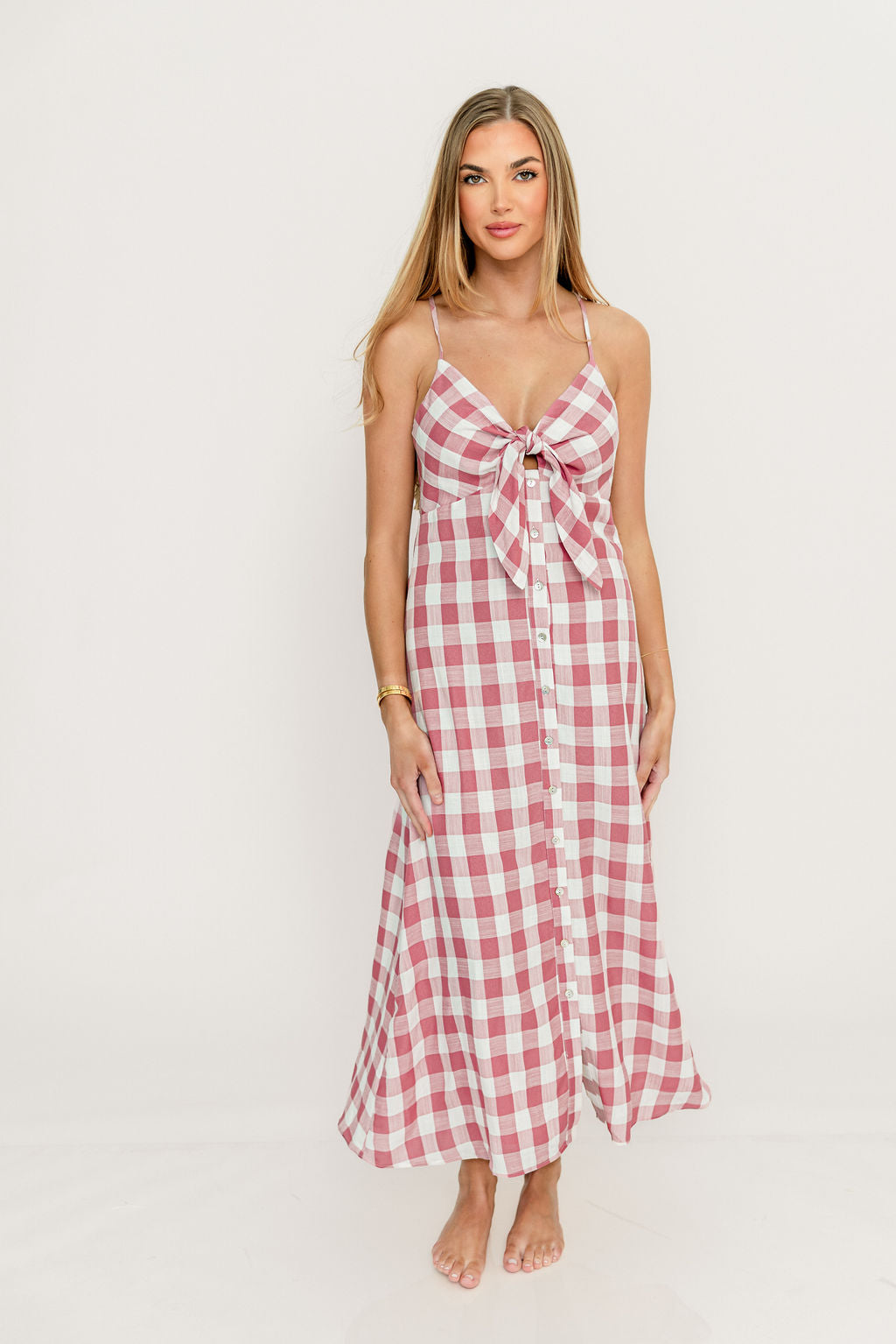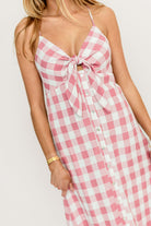 GARMENT DETAILS: Lightweight gingham-print midi dress with sweetheart neckline, oversized front tie detail, and functional front button placket. Features adjustable spaghetti straps, back zipper closure, and a fit-and-flare silhouette. No lining.