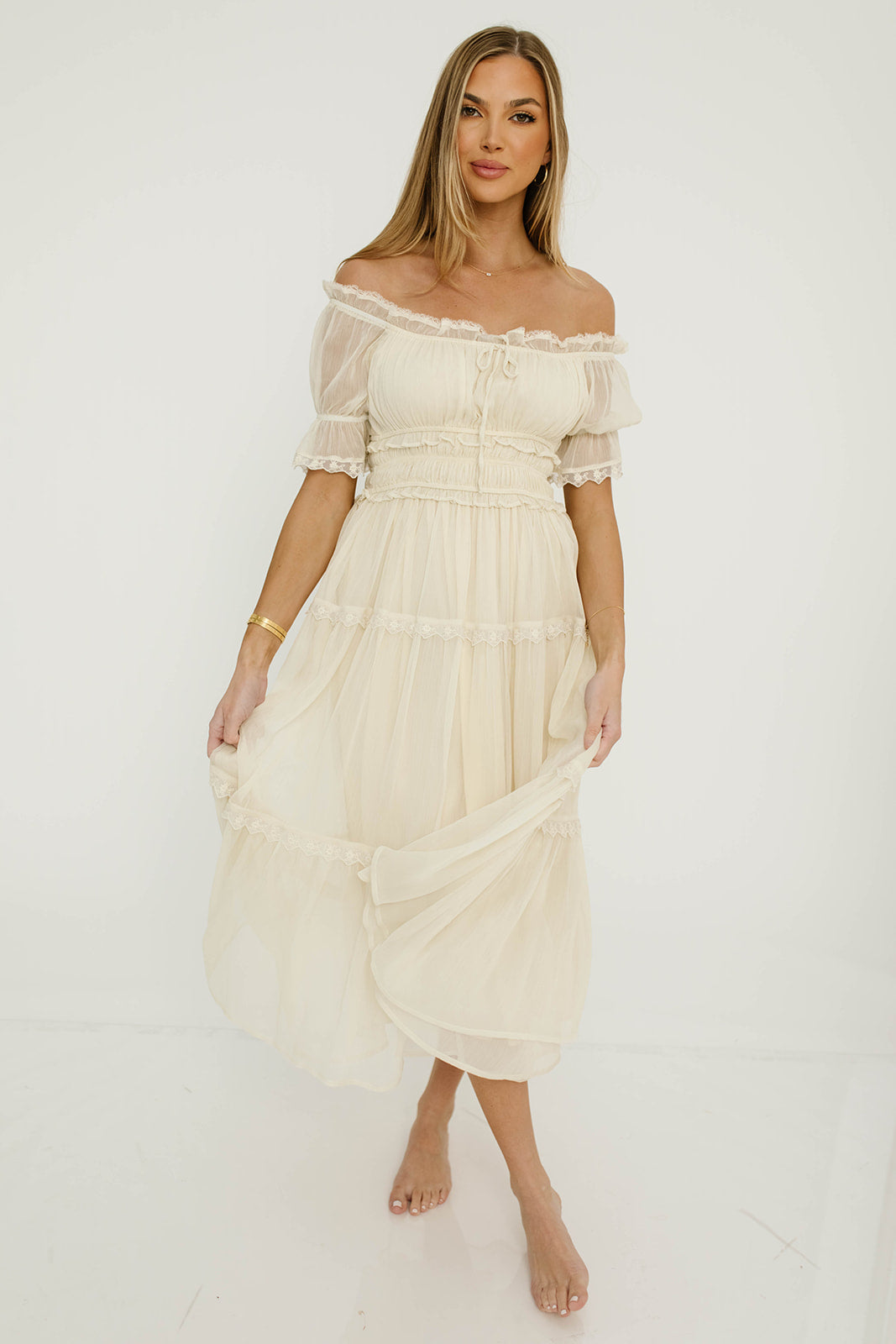 Meet the lovely Marla Maxi, a cloud-like concoction of lace and ruffles and sheer fabric that subtly flutters with every step. This charming gown has an elasticated neckline that can be worn on or off the shoulders, with gathered puffed sleeves, a defined waist, and an elegant, multi-tiered skirt with full lining and flowy sheer overlay. Make the Marla yours, just in time for Easter and spring events!