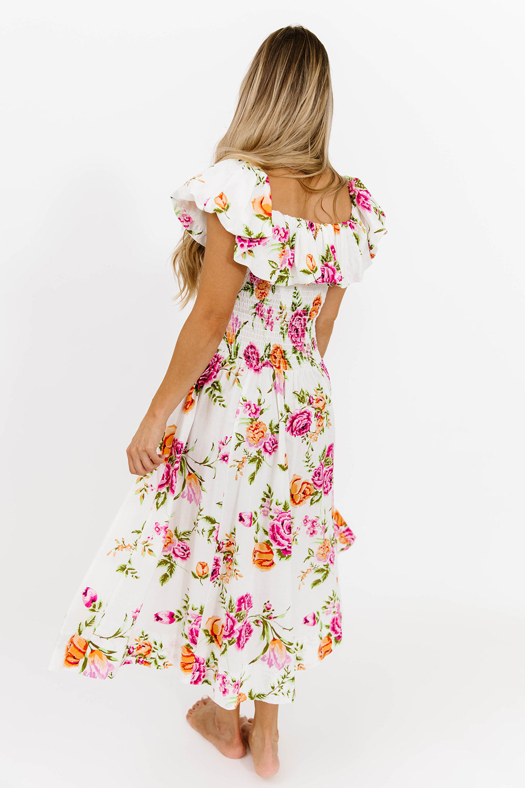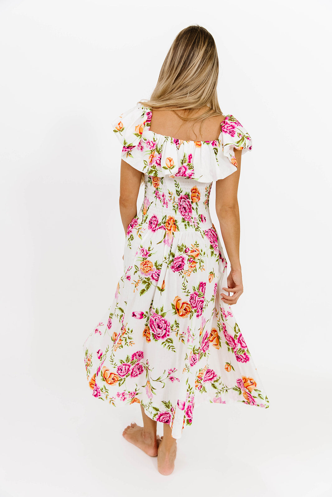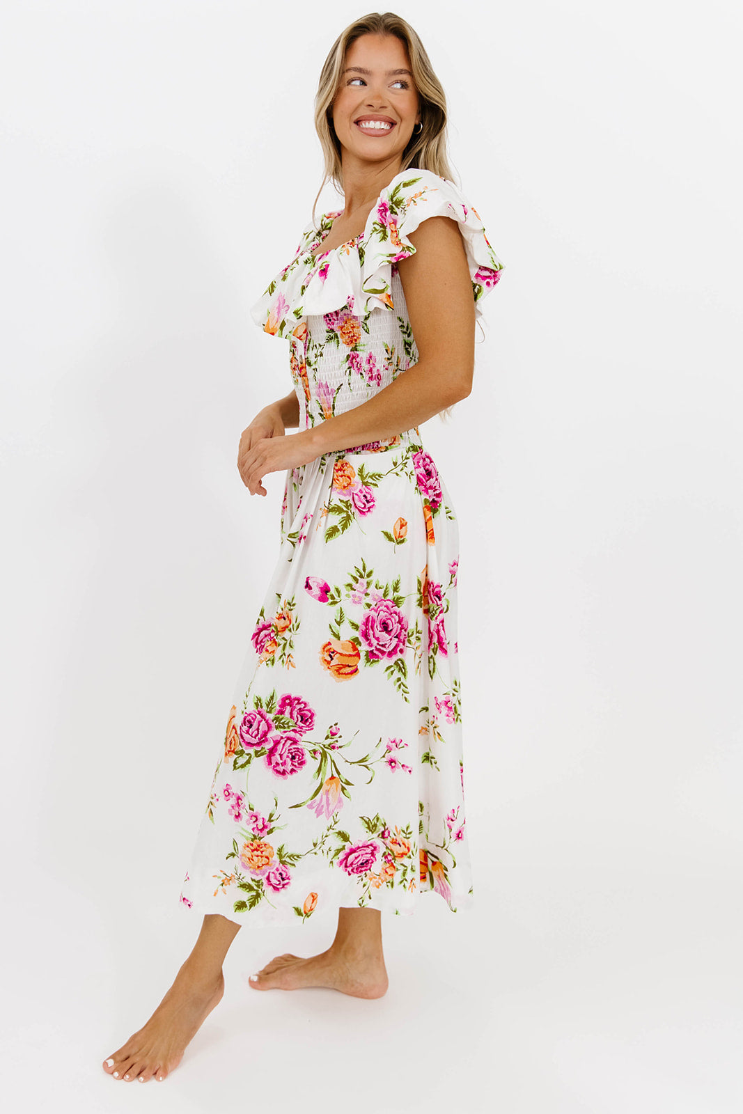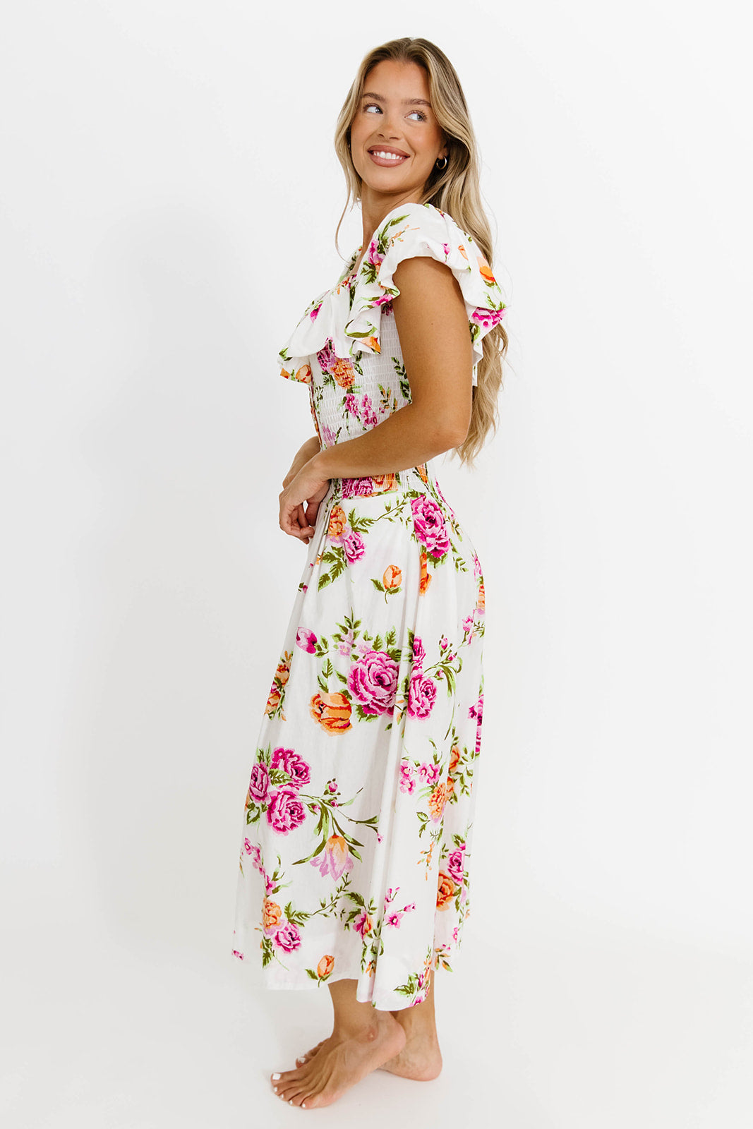 Elena Floral Print Smocked Midi Dress in Blue - Bump Friendly & Inclusive Sizing