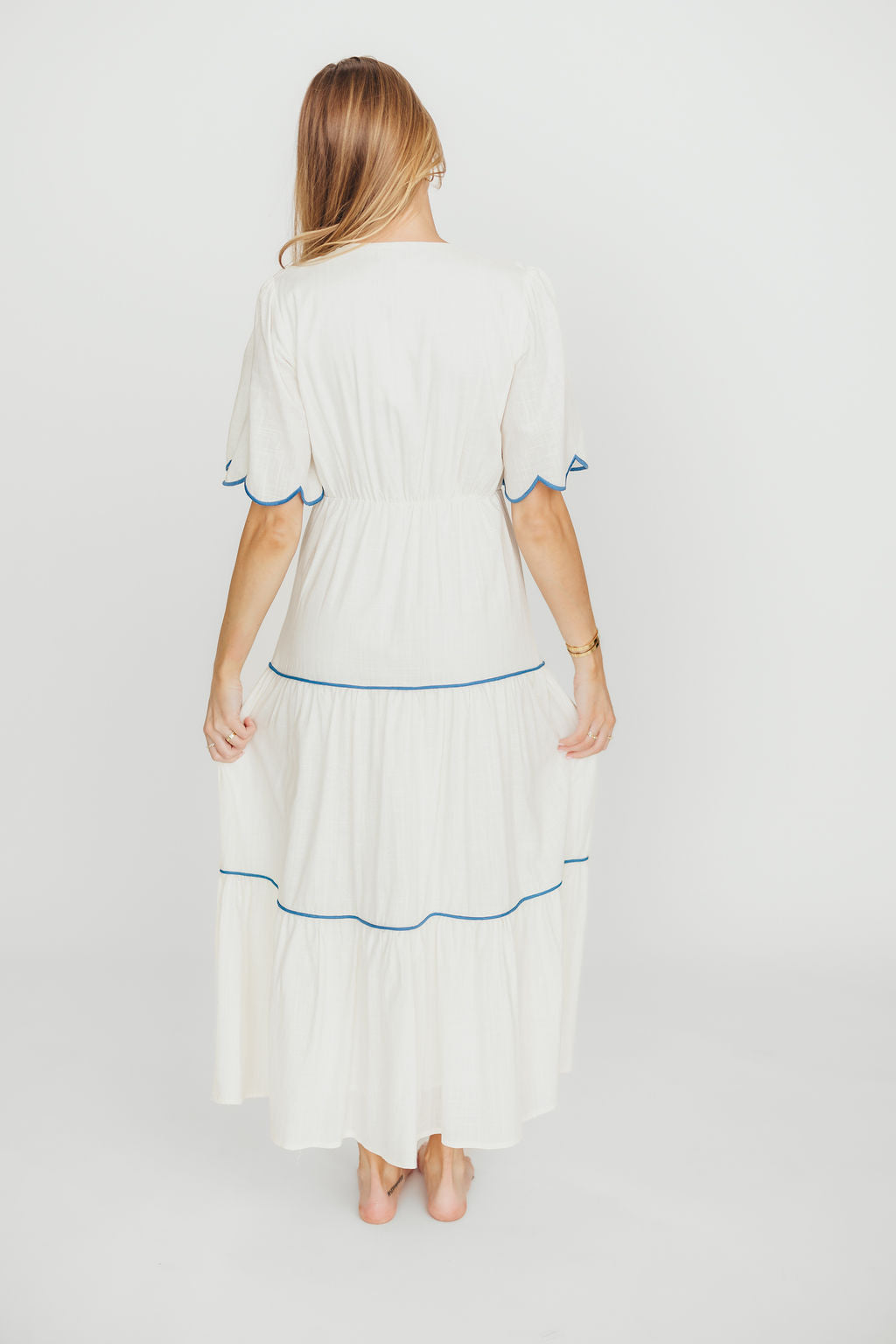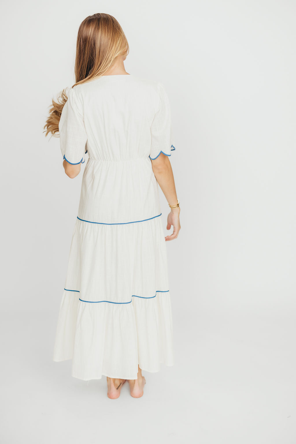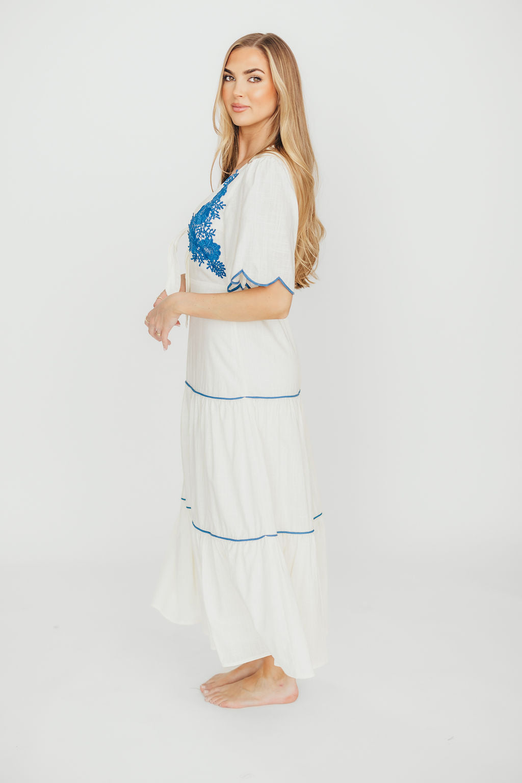Lena Embroidered Tiered Midi Dress in Off-White/Blue *Final-Sale*