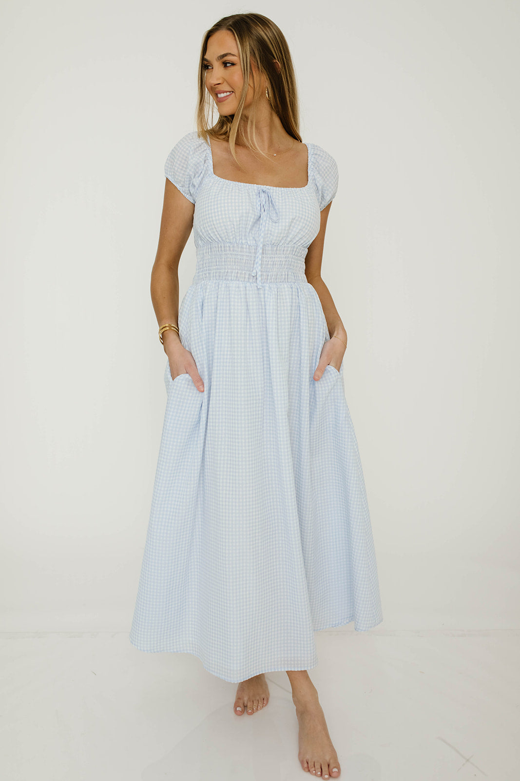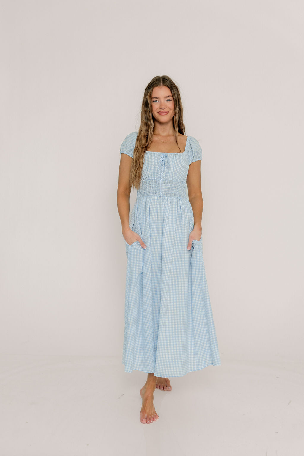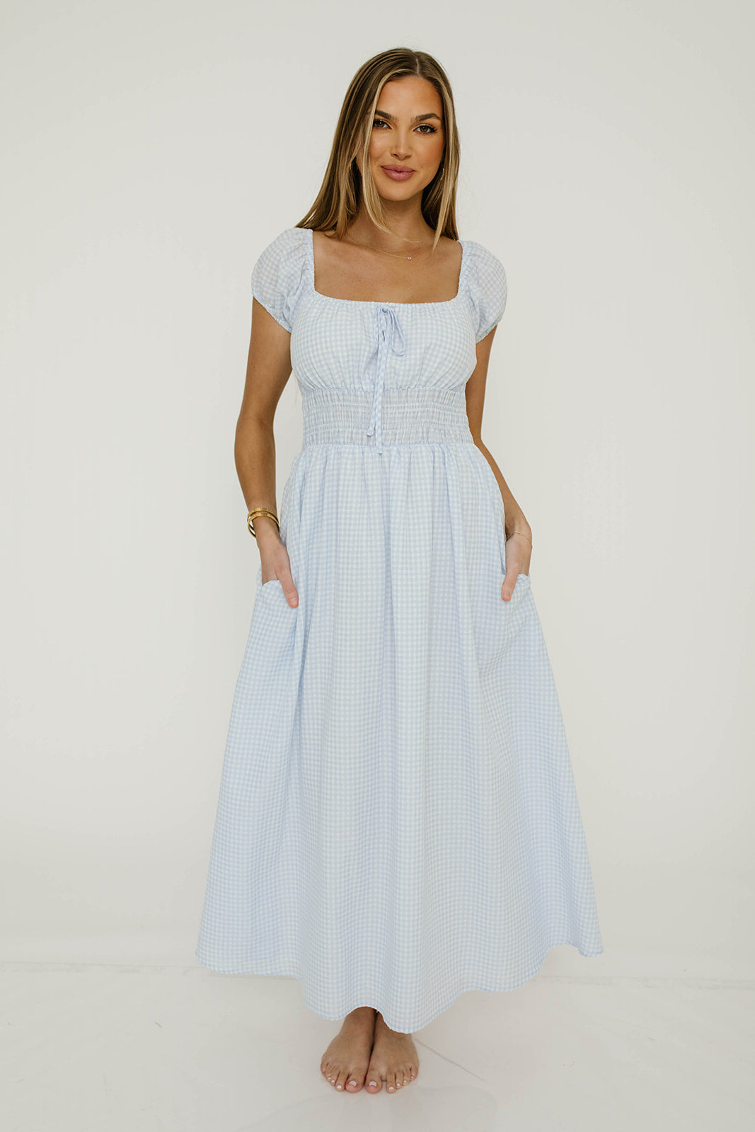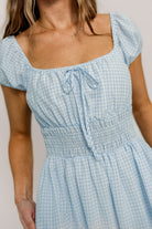 GARMENT DETAILS: Lightweight maxi dress in a charming gingham print. Features square neckline, capped sleeves, and stretchy smocked waist panel, with front tie detail. Finished with dual side pockets and a flowy, comfortable maxi skirt.