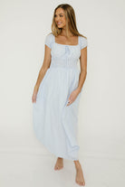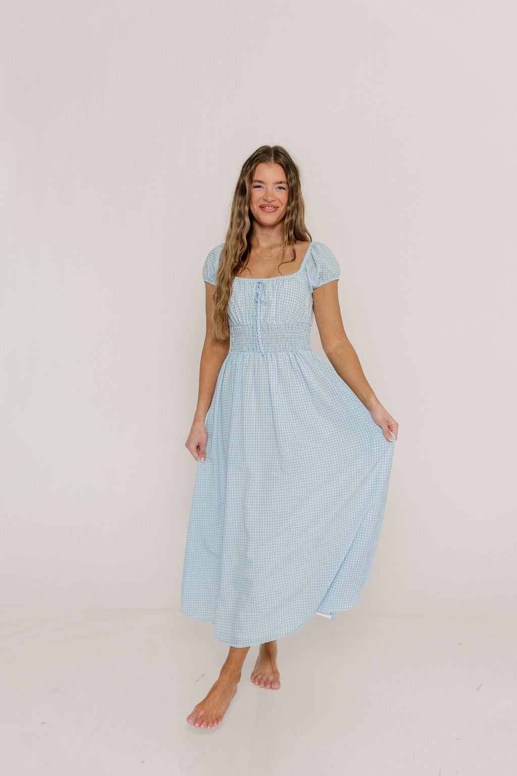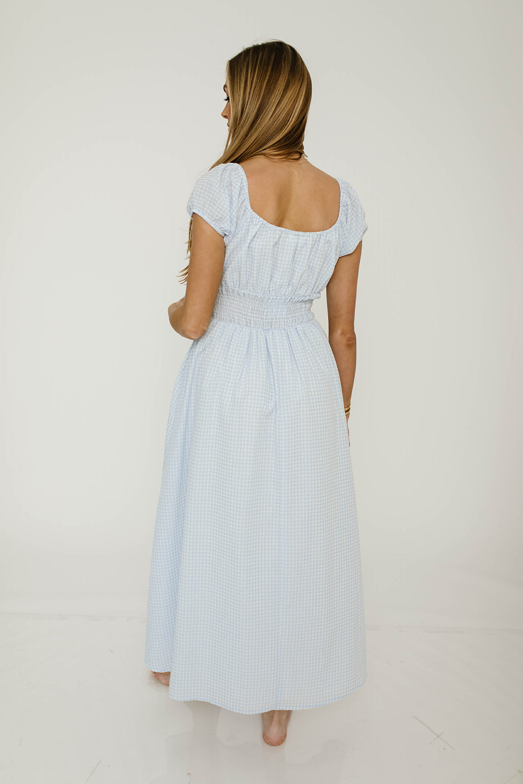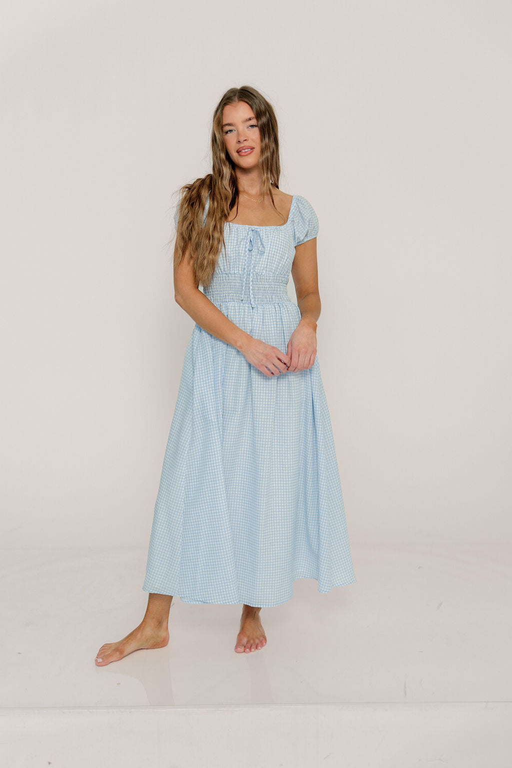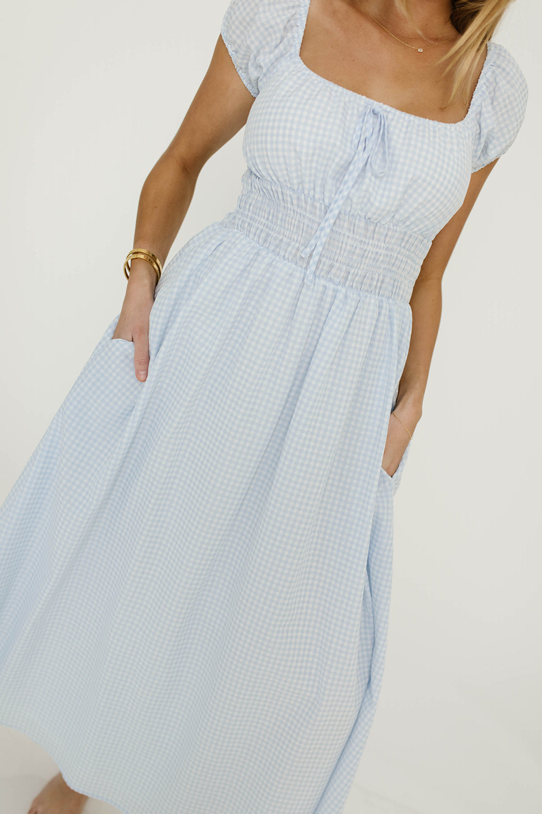 GARMENT DETAILS: Lightweight maxi dress in a charming gingham print. Features square neckline, capped sleeves, and stretchy smocked waist panel, with front tie detail. Finished with dual side pockets and a flowy, comfortable maxi skirt.