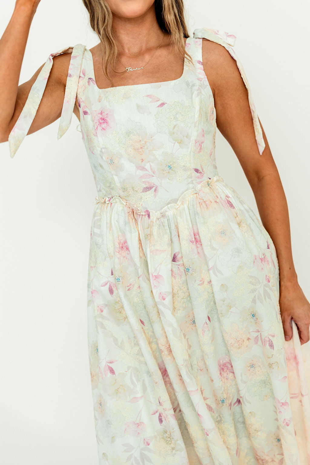 GARMENT DETAILS: Vintage-inspired sundress withs square neckline, adjustable self-tie shoulder straps, and a fitted, defined bodice with flattering, A-line skirt. Features dainty ruffle details and full lining.